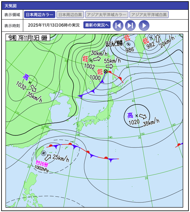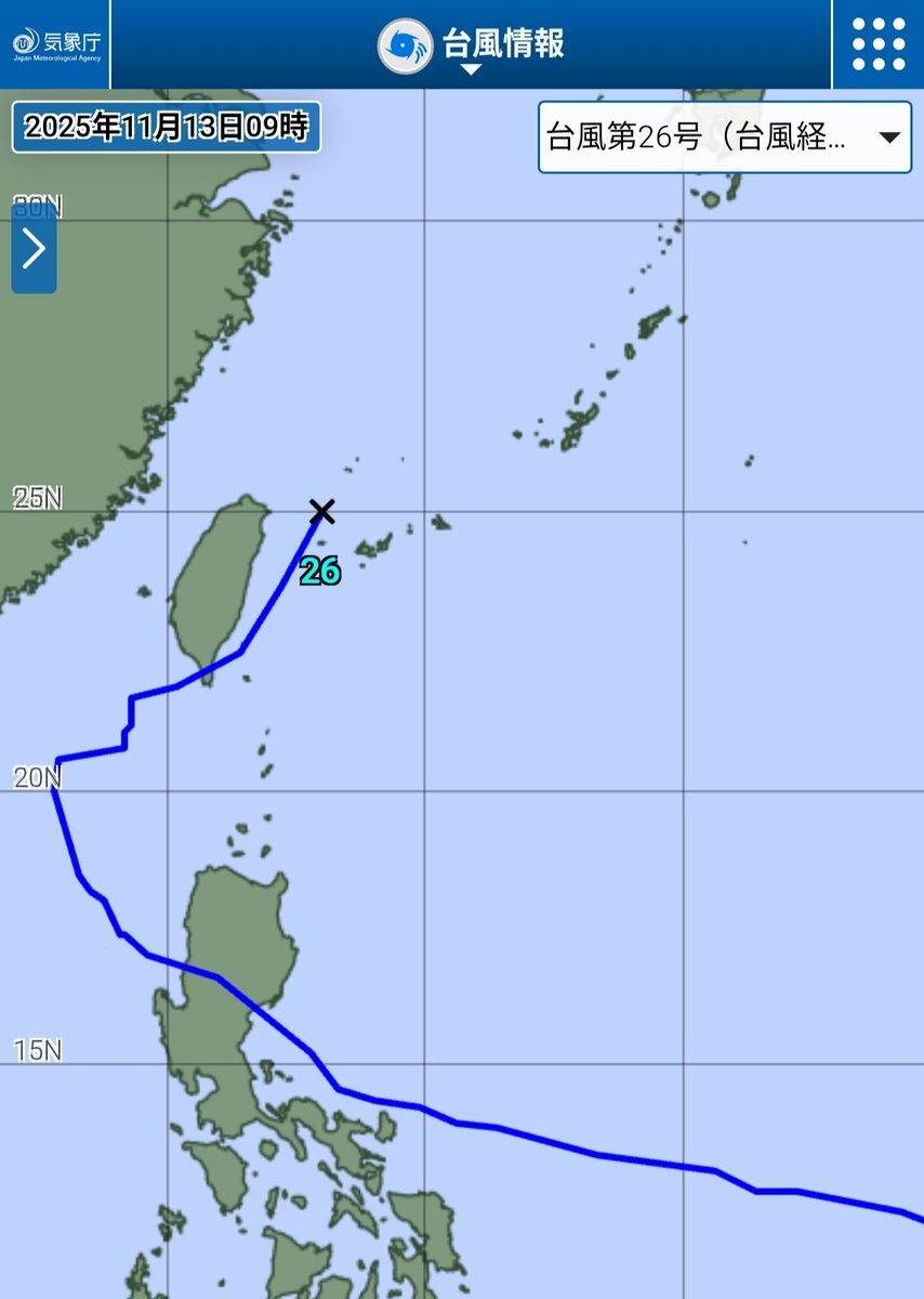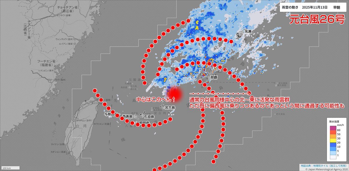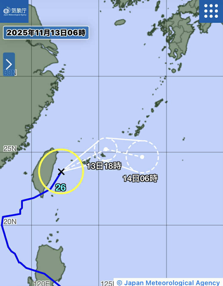 【台風情報】 11月13日(木)9時に台風26号(フォンウォン)は温帯低気圧に変わりました。 沖縄付近に停滞する前線の活動は引き続き活発になっていて、沖縄や奄美、種子島・屋久島などは今夜にかけて非常に激しい雨に警戒が必要です。 weathernews.jp/news/202511/13…