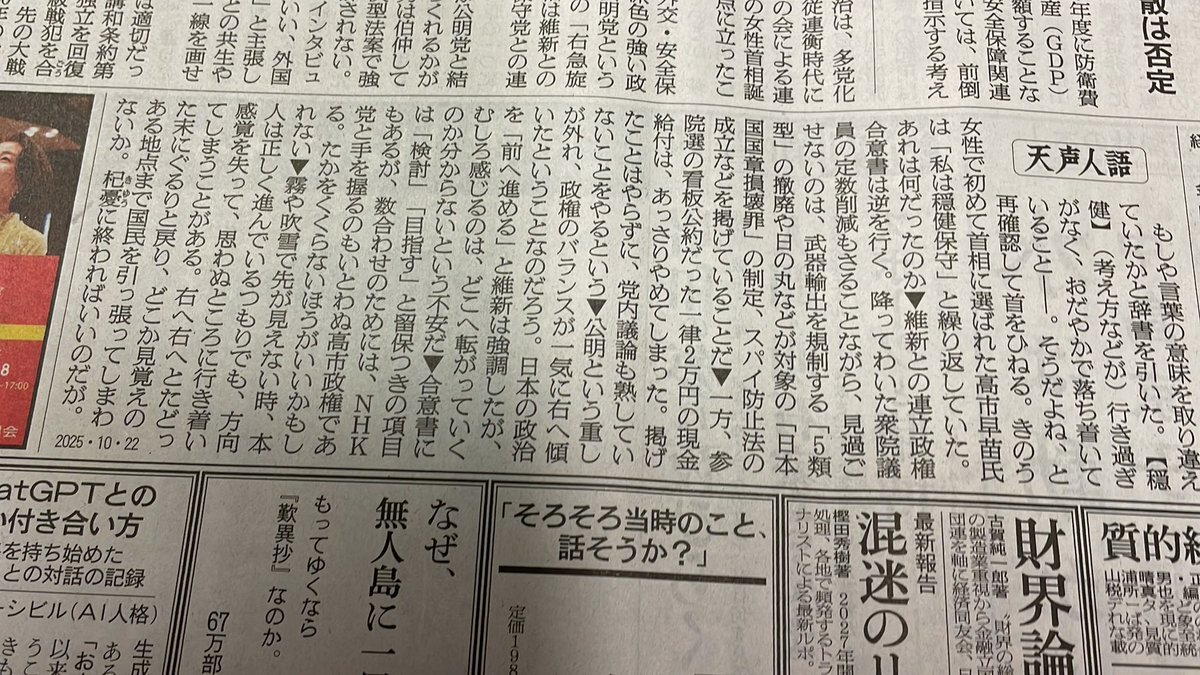 最悪の政権だとトレンドにあったけれど、政治ニュースに興味ある人以外には「女性首相&若くてテレビ慣れした男(実は国会議員ですらない大阪知事・50歳)」という「最高にフレッシュなコンビ」に見える可能性があるのがこわい。だからメディアが大切なのにすでに礼賛ムード。