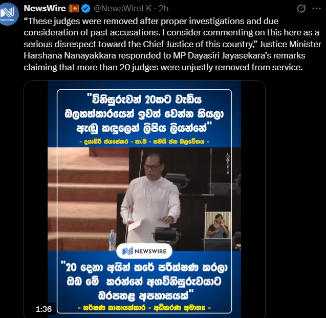 ダヤシリ議員の「裁判官20人超が不当解任」発言に対し、ハーシャナ・ナヤッカラ法相が反論。「裁判官らは適切な調査と検討を経て解任された。ここでコメントするのは最高裁長官への深刻な侮辱だ」と述べた。 #スリランカ #司法 #国会 #政治 pic.x.com/r8sqCJrQQs