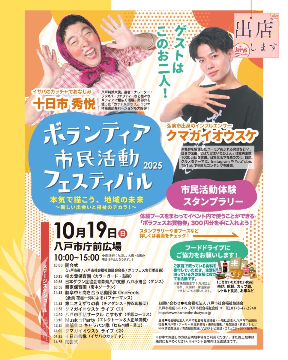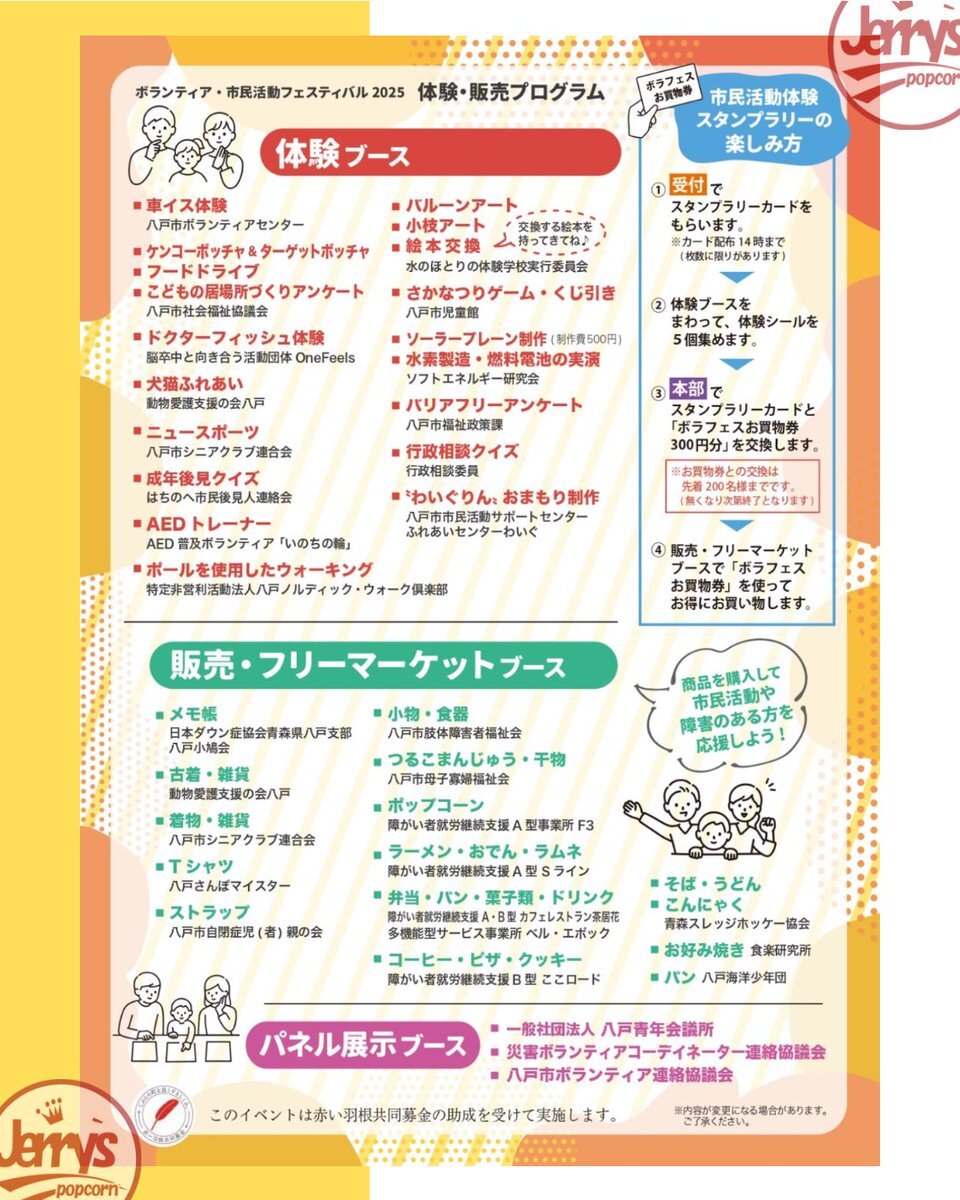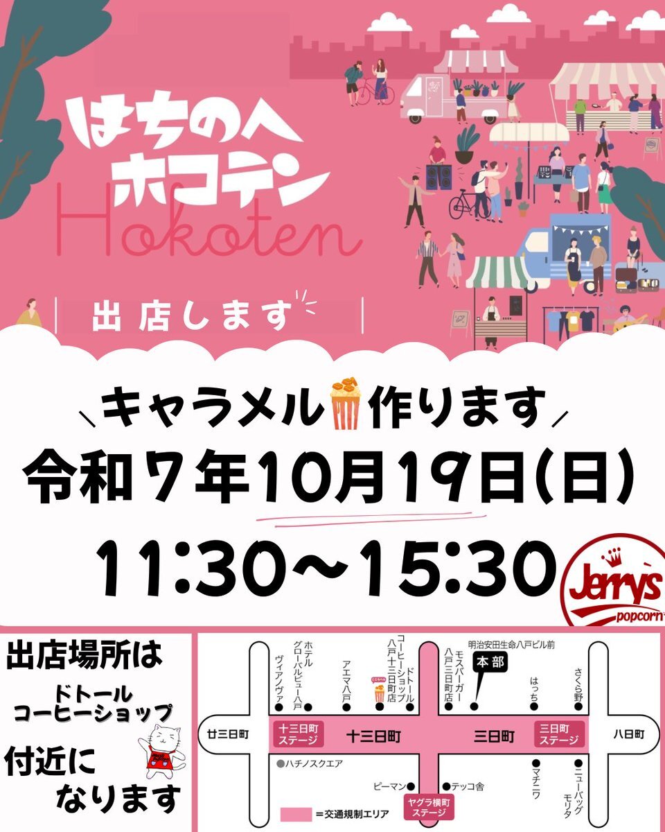 <イベント> 令和7年10月19日(日) ボランティア市民活動フェスティバルに出店します🍯 時間:10時00分〜 場所:八戸市庁前広場 #ジェリーズポップコーン #ポップコーン専門店 #トランス脂肪酸ゼロ #合成着色料不使用 #八戸 #グルメ #おやつ #はちのへホコテン #フリーマーケット #スタンプラリー #パン pic.x.com/mTaTDiMu8z