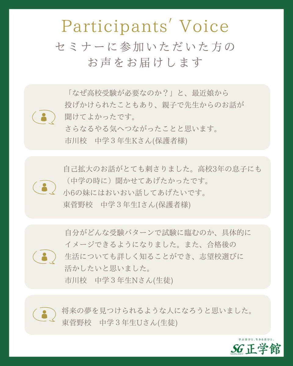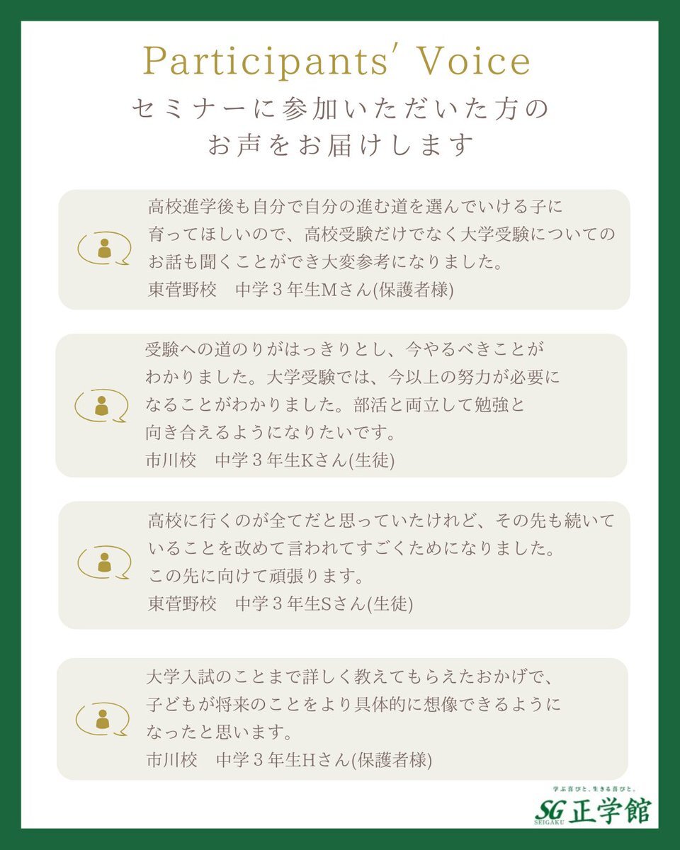 正学館では高校受験をされる生徒、保護者の皆様を対象にしたセミナーを開催しました。 今回は市川エリアのセミナーにご参加いただいた方のお声です。 sg-seigaku.co.jp # #個別指導 #合格保証 #高校受験 #市川 #松戸 #合格実績 #個別指導塾 #中学生 #成績保証 #受験対策 #無料体験受付 pic.x.com/ENYPqo41KA