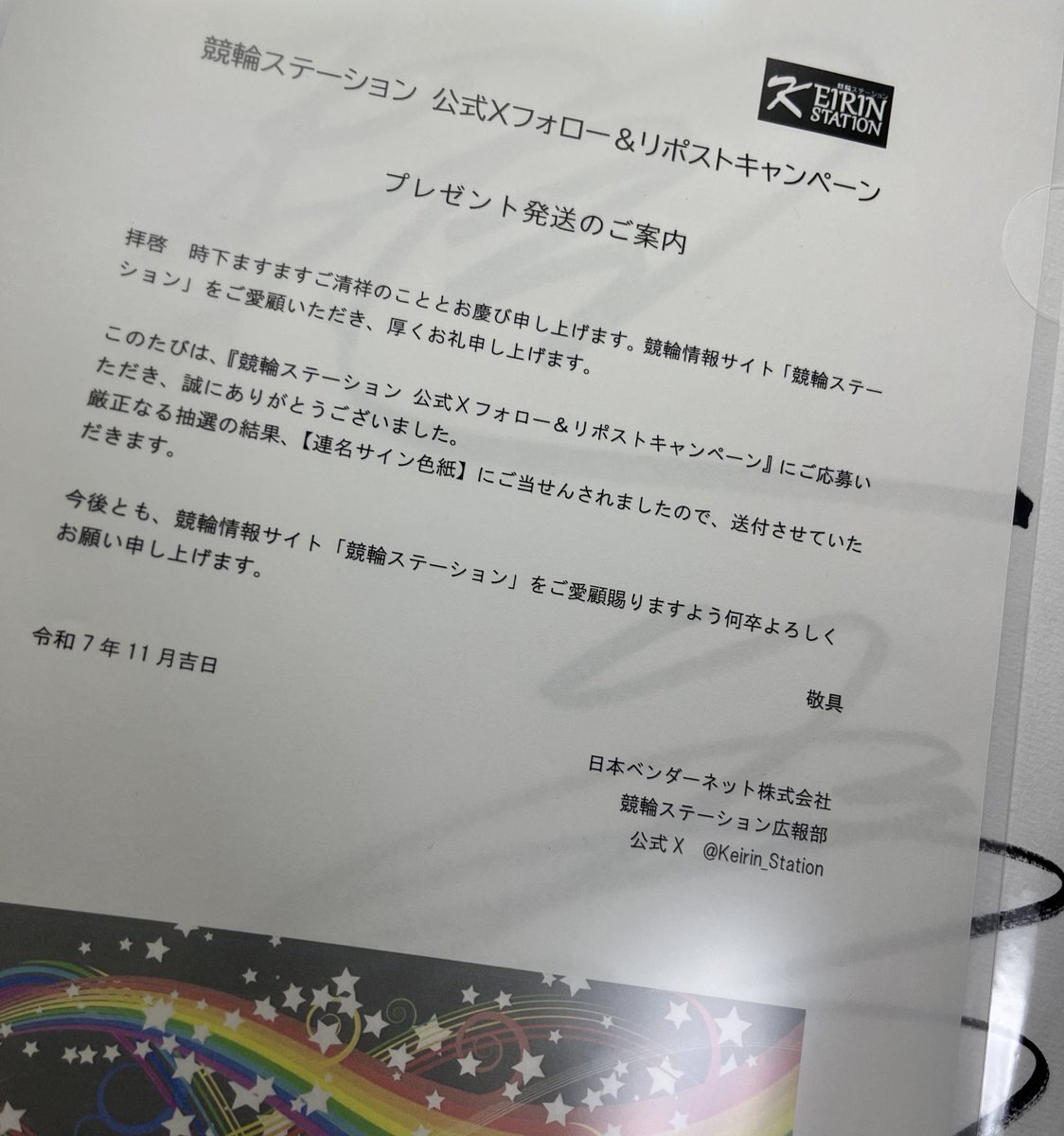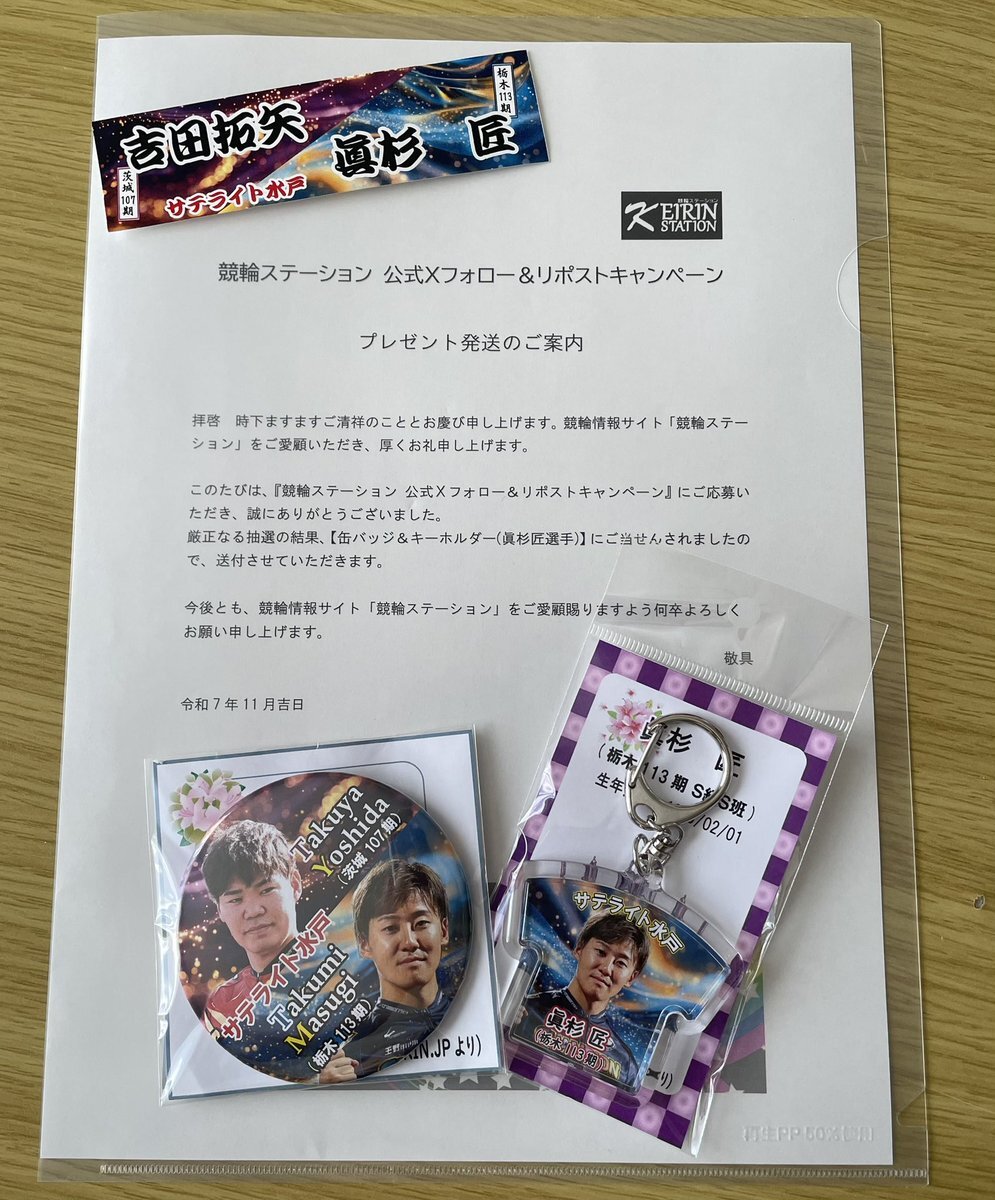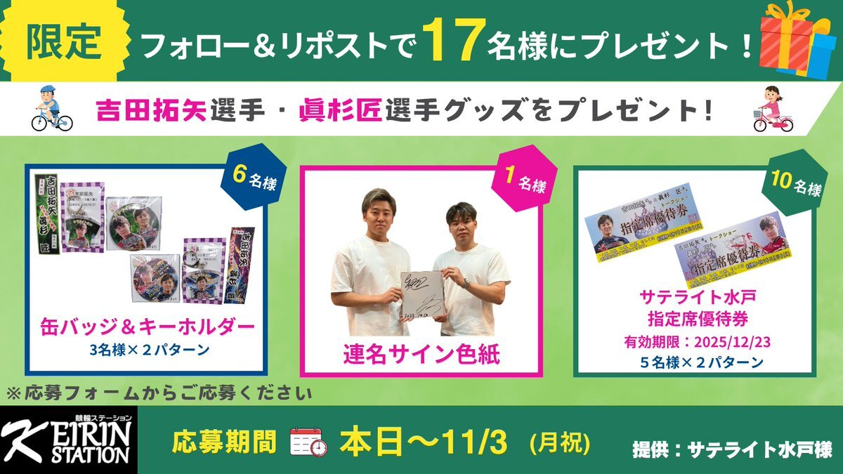 ✨フォロー&リポストで豪華賞品プレゼント! #吉田拓矢 #眞杉匠 両選手グッズほか 🎁賞品🎁 ・サイン色紙(1名) ・缶バッジ&キーホルダー(6名) ほか 応募方法 1 @Keirin_Station をフォロー 2 この投稿をリポスト 3 応募フォーム📝ws.formzu.net/dist/S34299344/ 締切: 11/3(月祝) ※詳細はフォームで!