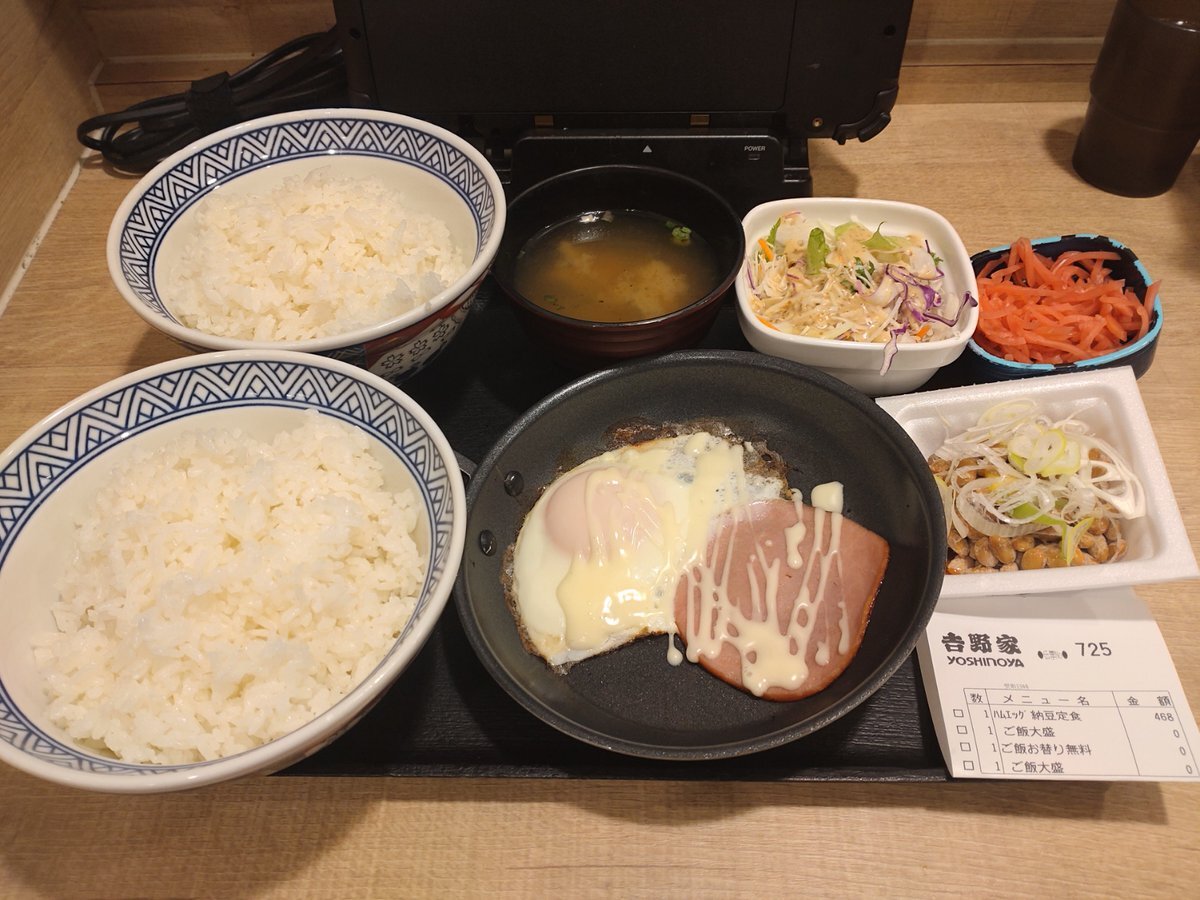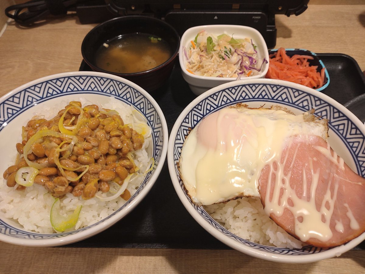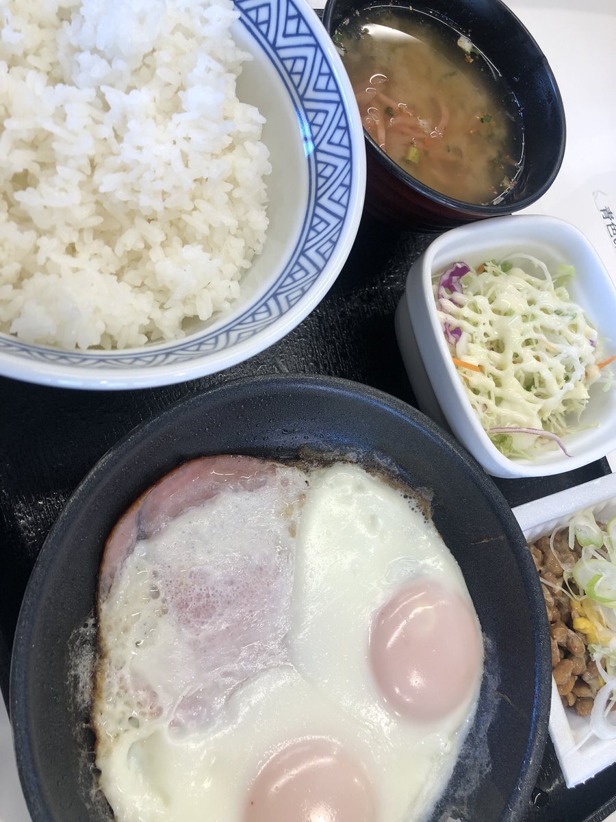 土曜日の朝食は #吉野家 ・ハムエッグ納豆定食(ご飯大盛) ・おかわりご飯(大盛) ¥468 朝食🍚目当てで訪店😊 ご飯増量・おかわり無料は嬉しいサービス🎉 おかずが無くなったのでご飯3杯目は断念🤨 コスパも良く、美味しかったです😋 ごちそうさまでした🙏 pic.x.com/gdG42f1Cir