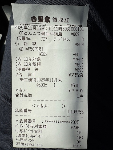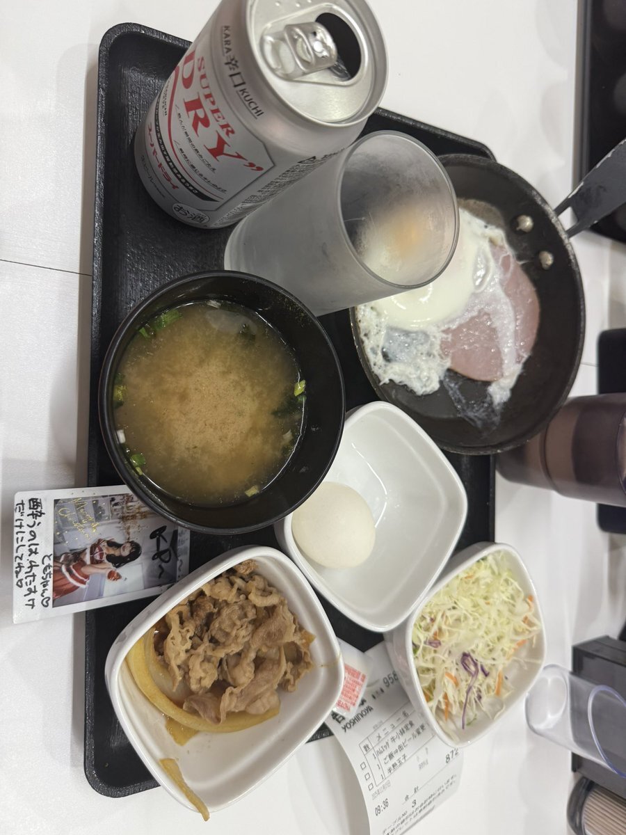 ガルクラ終わりに吉野家来たけど 深夜料金取られるの知らなかった とんこつ醤油牛鍋キャンペーンで 10%OFFだったのに 深夜料金10%でプラマイゼロ しかもVポイントは割引価格で ついてた😭 #吉野家 #ガルクラ pic.x.com/2XfRHVg7P3