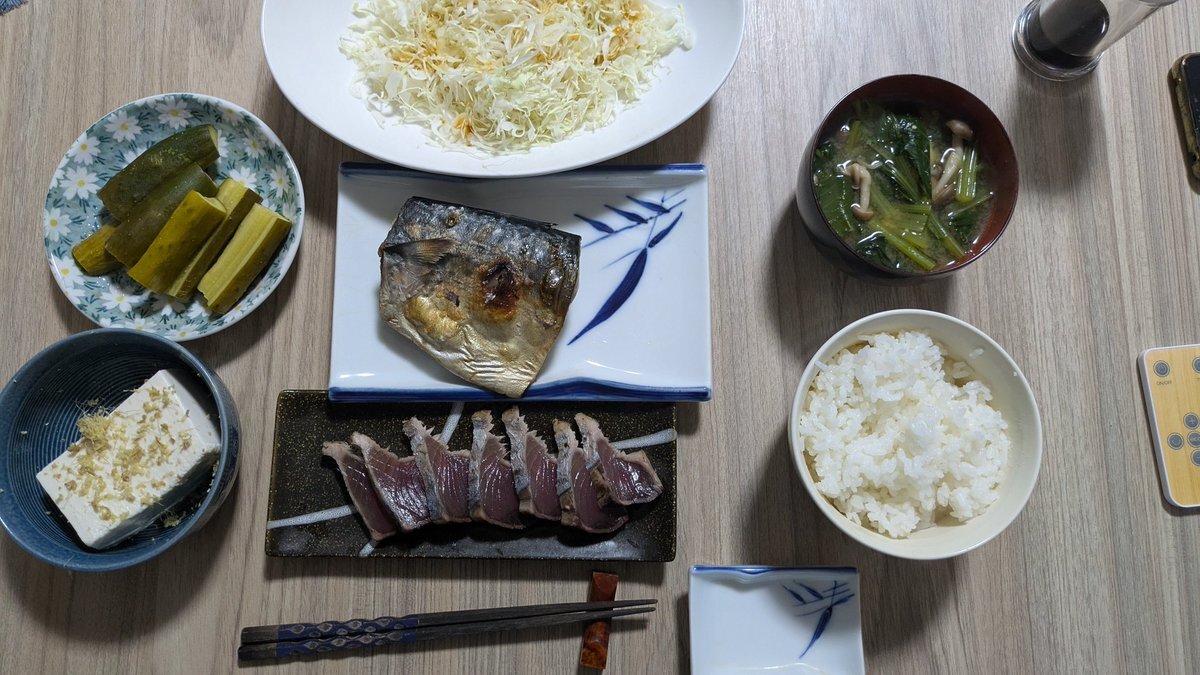 サバ塩焼き かつおのたたき 冷奴 ぬか漬け コールスロー 味噌汁 ご飯 #4毒抜き #税は財源じゃない #日本誠真会は嘘をつかない #政策より誠実 #日本誠真会はカッコいい #吉野敏明を総理大臣に pic.x.com/rNAZh8q6Ex