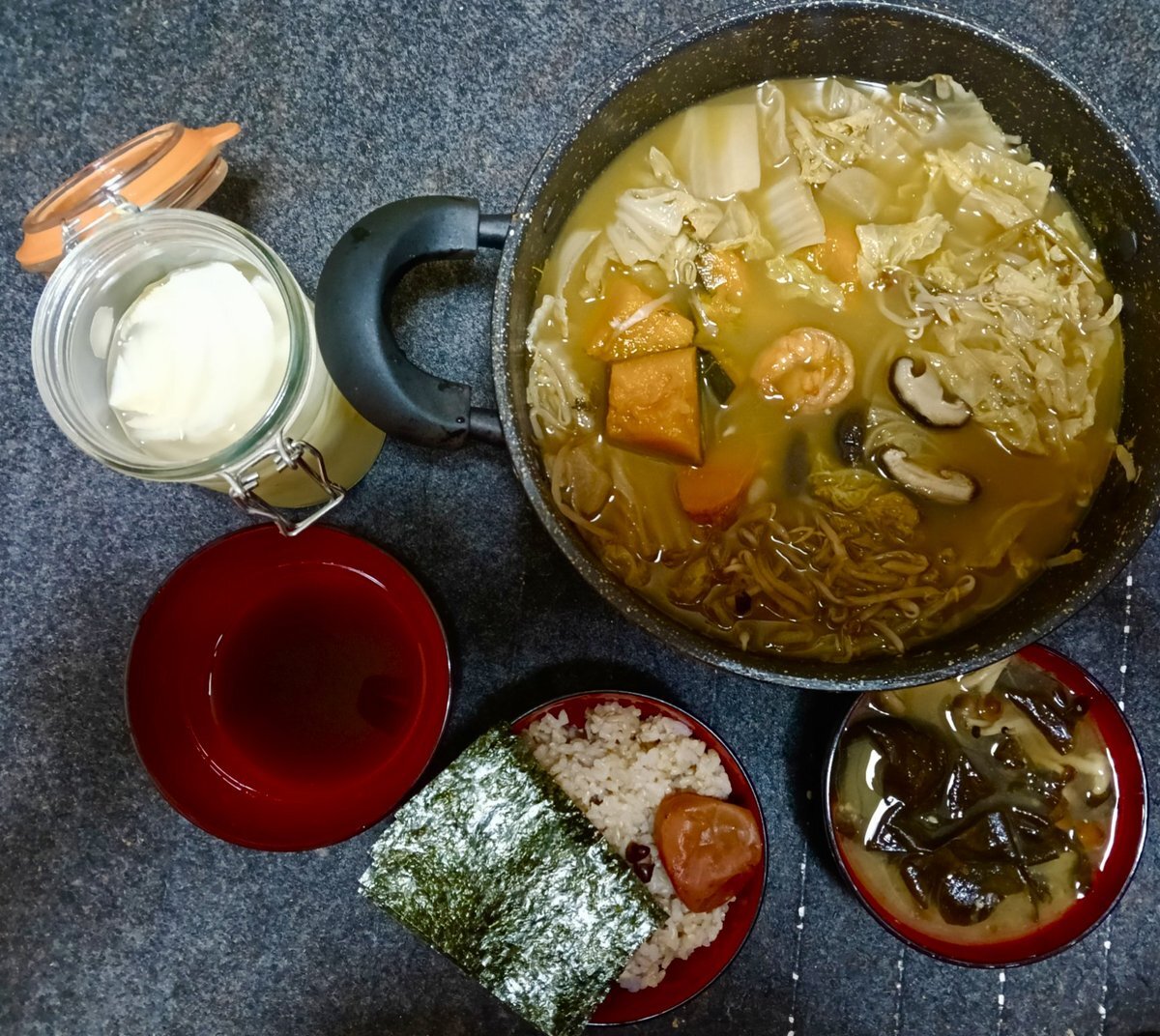 お鍋 玉ねぎの酢の物、 梅干し、 焼き海苔、 しめじとなめことワカメのお味噌汁、 国産無農薬玄米雑穀米❗ 食に感謝🎶いただきまーす🎶ありがとうございます🎶 全部美味♥ #四毒抜き #四抜き #吉野敏明 #吉野としあき #日本誠真会は嘘をつかない #吉野敏明を総理大臣に pic.x.com/gwgxxhpqWF