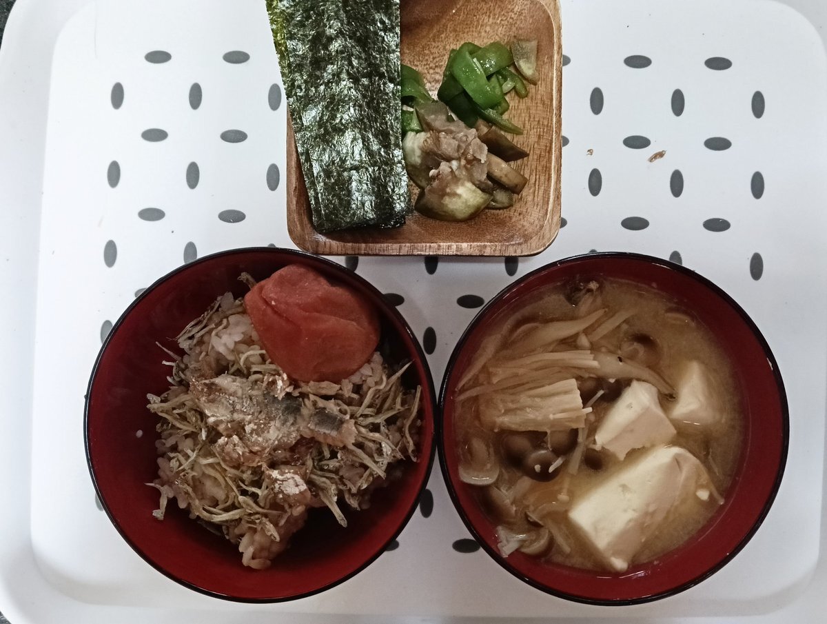 よしりんとノリちゃんのお魚ご飯から小魚、 ナスとピーマンのぬか漬け、 焼き海苔、 梅干し、 しらす、 豆腐とえのきとしめじのお味噌汁、 国産無農薬白米玄米雑穀米❗ 食に感謝🎶いただきまーす🎶ありがとうございます🎶 全部美味♥ #四毒抜き #日本誠真会は嘘をつかない #吉野敏明を総理大臣に pic.x.com/huD4e1OyVT
