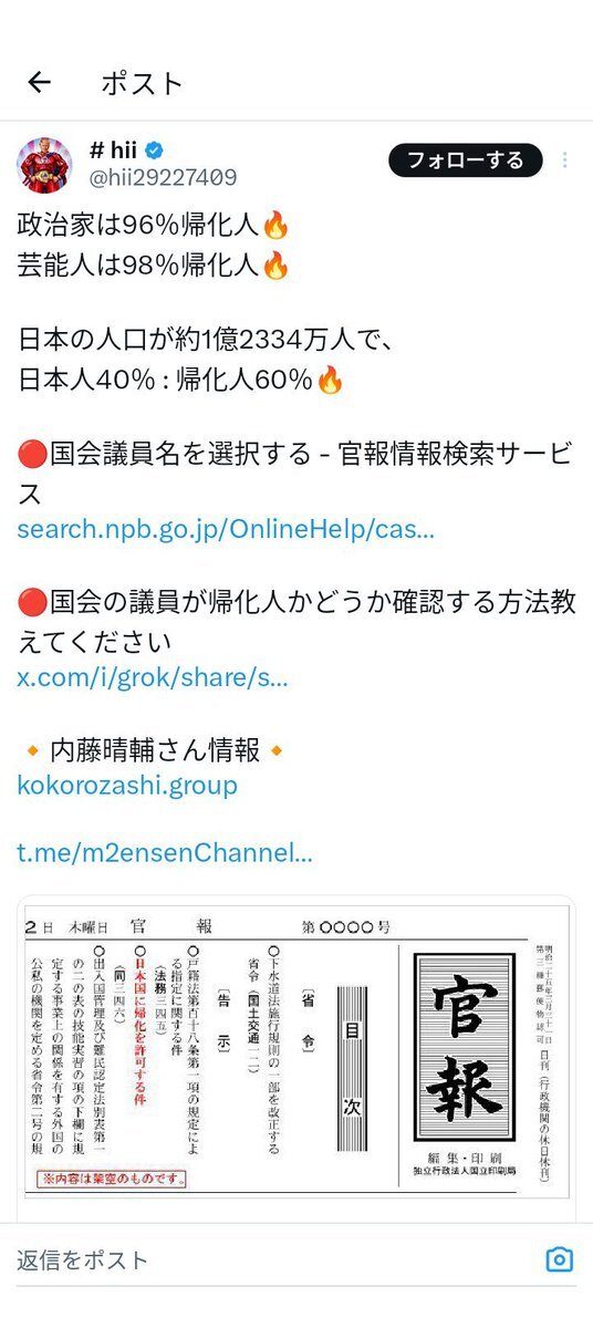 返信先:@KadotaRyusho答えは簡単。日本人ではないから。反日偽日本人。 #代理統治システム在日ミッション終了 #明治維新の志士達は在日朝鮮人 これからの日本は純日本人だけになり本来の姿に戻る。 例外はなく不法移民の総計7400万人全部の強制送還行使を確認 #既定路線 #旧体制終了 #同和と在日の終焉 #不法移民強制送還 pic.x.com/HI3kA9tmaF