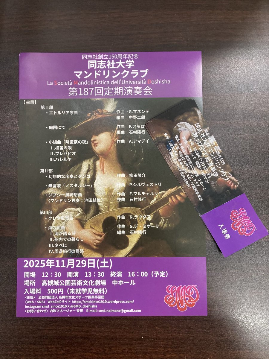 🆕チケット情報ℹ️ 同志社大学マンドリンクラブ @SMD_doshisha 第187回 #定期演奏会 のチケットを受け取りました! サロットでお求めいただけます♪ ワンコイン500円❗️ あなたも歴史の目撃者に!! #同志社 #定演 #マンドリン #ギター #クラシックギター x.com/takekiyo_GtMn/…