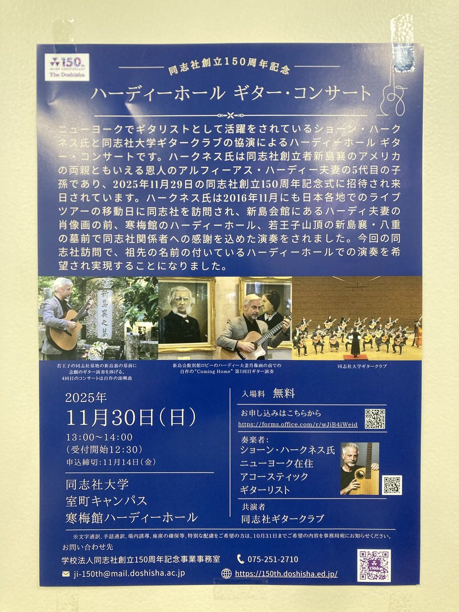 📢本日の公演ℹ️at同志社大学 京都 #同志社創立150周年 記念 ハーディーホール ギター・コンサート ハーディーさんの御子孫さんがギタリストだったとは!!同志社ギタークラブ@doshisha_guitar さんとの共演! 会場はもちろん、ハーディーホール! #ギター #クラシックギター #同志社 #同志社150周年 pic.x.com/H5hBQoFpj4