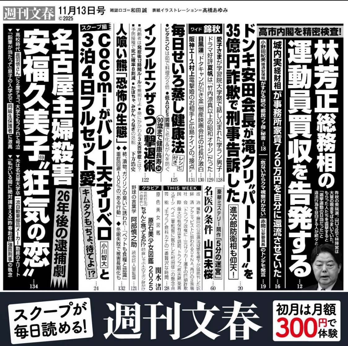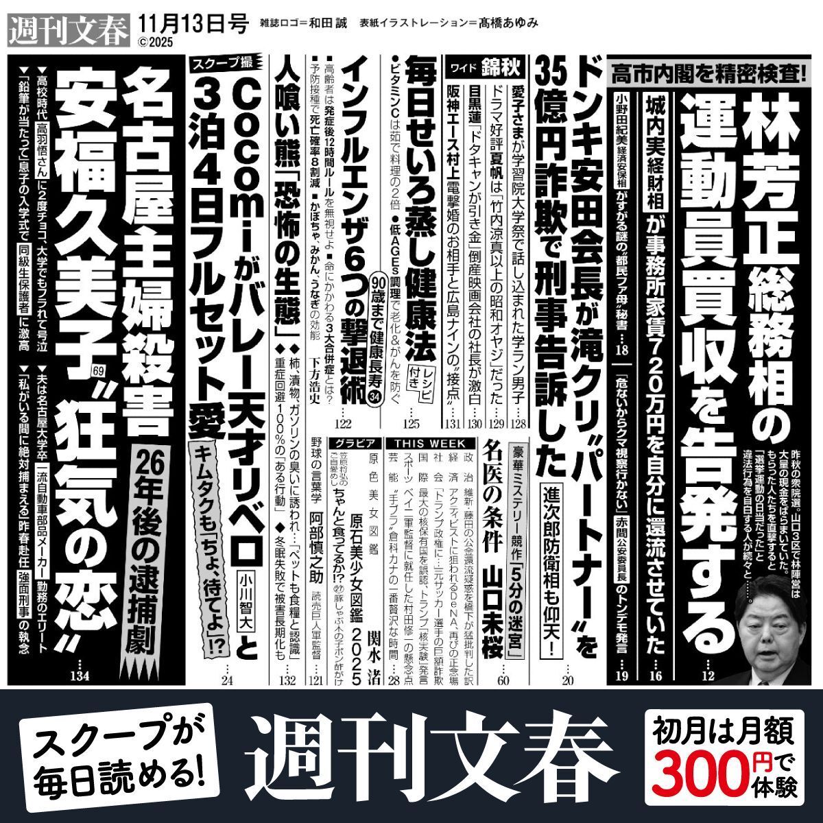 今週の『週刊文春』目次は―― ▼林芳正総務相の運動員買収を告発する ▼ドンキ安田会長が滝川クリステル“パートナー”を35億円詐欺で刑事告訴した! ▼Cocomiが男子バレー・小川智大と3泊4日愛 ▼名古屋主婦殺害 容疑者“狂気の恋” 電子版なら今すぐ読める! bunshun.jp/denshiban/info…