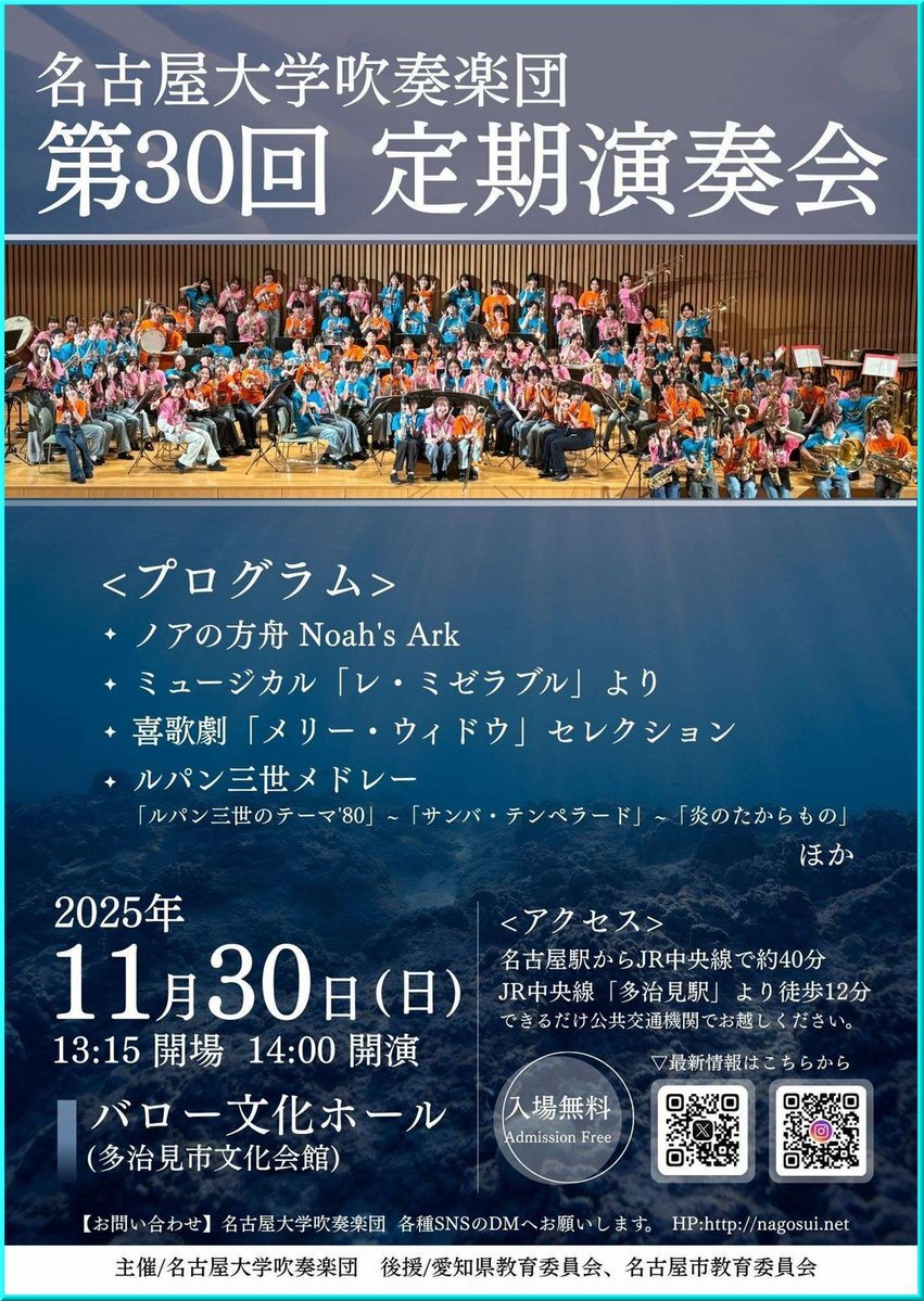 11月30日(日) 岐阜 多治見 #吹奏楽 定演 情報 名古屋大学吹奏楽団 第30回定期演奏会 nagosui.net ノアの方舟 Noah's Ark ミュージカル「レ・ミゼラブル」より 喜歌劇「メリー・ウィドウ」セレクション バロー文化ホール 13:15op 14:00st 入場無料 #名古屋大学吹奏楽団 #Gifu20251130 pic.x.com/Vd5ekxqWeN