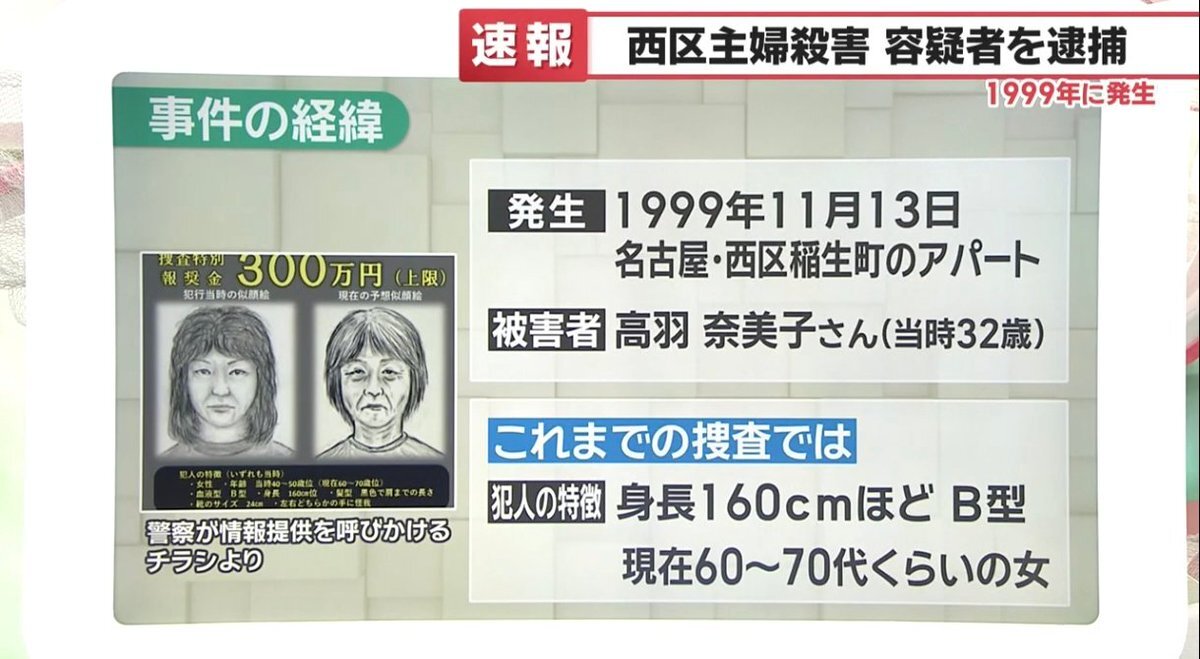 26年前の名古屋市西区の主婦殺害事件、容疑者を逮捕 報奨金300万円の対象事件 1999年11月13日 #名古屋市西区稲生町 のアパートで主婦の高羽奈美子さん(当時32)が殺害された事件では、犯人が捕まらないまま25年以上が経過…愛知県警は先ほど、この事件について、容疑者を逮捕したことを明らかにした pic.x.com/fWbfr2PI4k