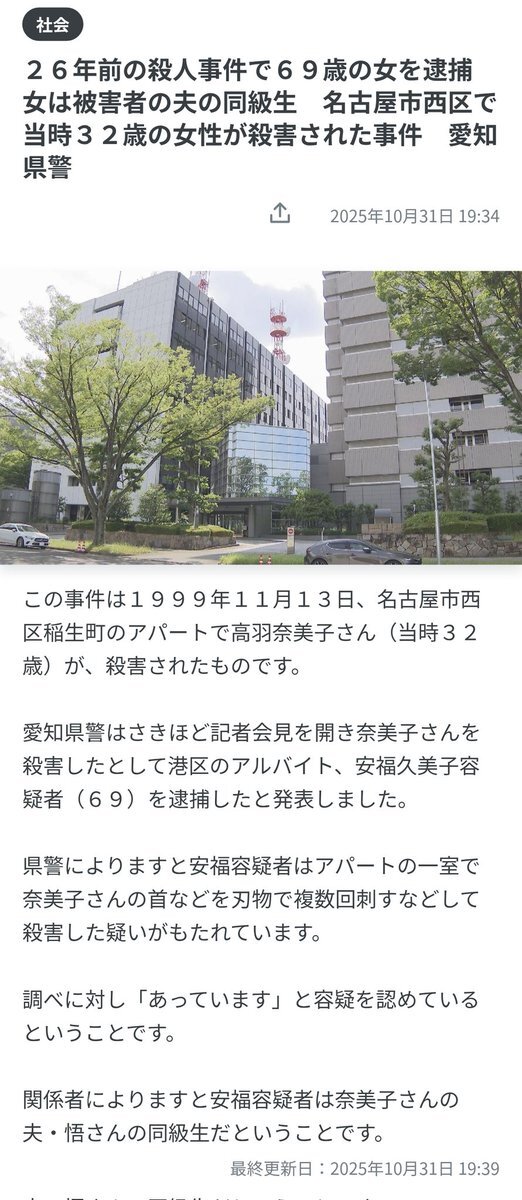 1999年11月13日 #名古屋市西区稲生町 のアパートで高羽奈美子さん(当時32歳)が殺害された事件 愛知県警は31日午後7時半から会見を開き、名古屋市港区のアルバイト #安福久美子 容疑者(69)を殺人容疑で逮捕したと発表 関係者によりますと安福容疑者は奈美子さんの夫・悟さんの同級生だということです pic.x.com/bFoUxQqACm