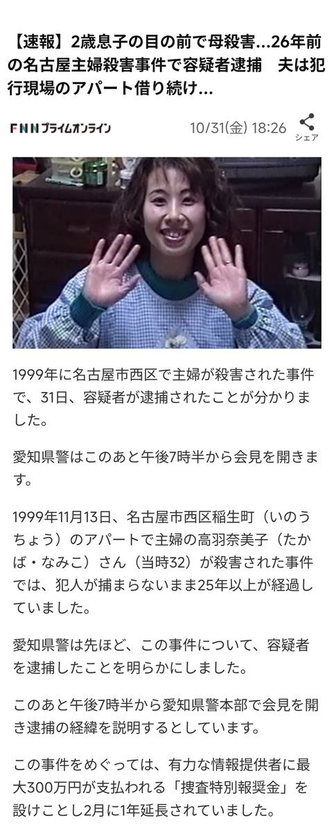 26年前の名古屋市西区の主婦殺害事件、容疑者を逮捕 報奨金300万円の対象事件 1999年11月13日 #名古屋市西区稲生町 のアパートで主婦の高羽奈美子さん(当時32)が殺害された事件では、犯人が捕まらないまま25年以上が経過…愛知県警は先ほど、この事件について、容疑者を逮捕したことを明らかにした