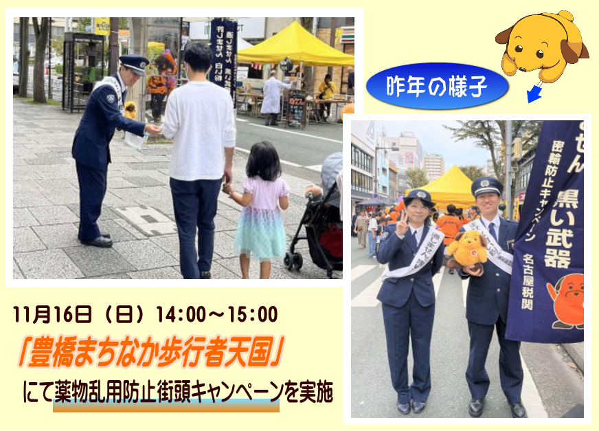 【イベント】 #名古屋税関 豊橋税関支署は、11月16日(日)14:00~15:00「豊橋まちなか歩行者天国」で、薬物乱用防止街頭キャンペーンを実施するワン🐾 税関は、薬物撲滅と密輸阻止を目指して日々活動中だワン! #税関 #豊橋 #豊橋まちなか歩行者天国 #薬物乱用防止 #カスタム君 pic.x.com/eILyn4J5VU