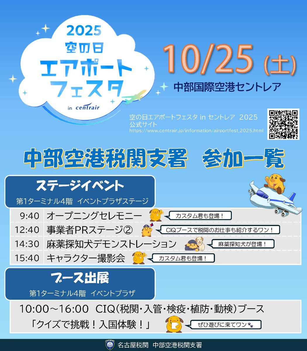 【イベント】 10月25日(土)「空の日エアポートフェスタinセントレア」のスケジュールだワン!CIQクイズラリーや麻薬探知犬デモンストレーション、ボクも登場するキャラクター撮影会に遊びにきてね🐾 centrair.jp/information/ai… #名古屋税関 #中部空港税関支署 #空の日 #セントレア #カスタム君 x.com/Custom_kun/sta…