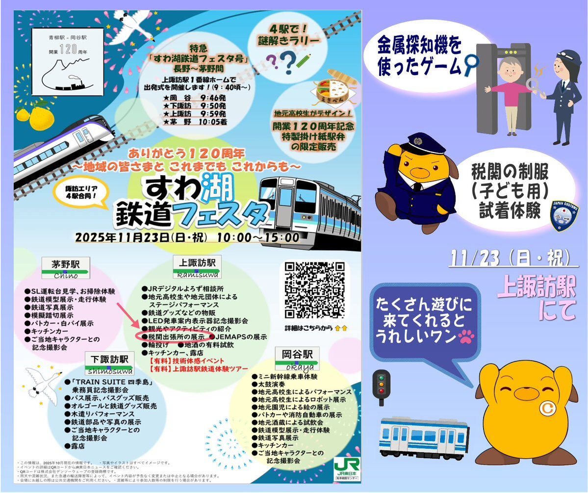 【イベント】 #名古屋税関 諏訪出張所は、11月23日(日・祝)、上諏訪駅で開催される「すわ湖鉄道フェスタ2025」に参加するワン! 金属探知機を使ったゲームや税関の制服(子供用)試着体験ができるよ♪ぜひ遊びに来てほしいワン🐾 #諏訪 #カスタム君 #鉄道 pic.x.com/tmGym84X3W
