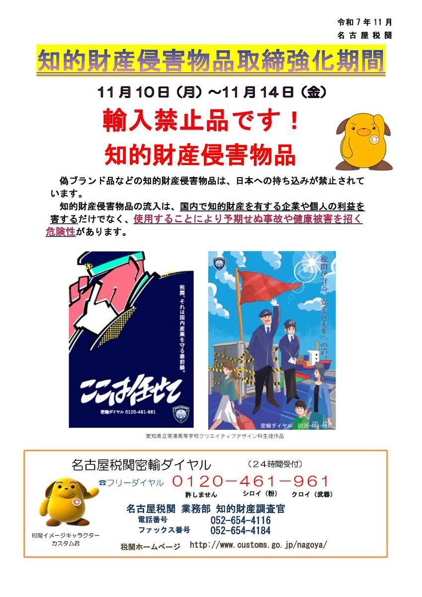【お知らせ】 「 #税関 は偽ブランド品などの知的財産侵害物品の輸入を認めないワン!!」  #名古屋税関 では、11月10日(月)~11月14日(金)「知的財産侵害物品取締強化期間」として、知的財産侵害物品の取締りを一層強化するワン! #知的財産侵害物品 #カスタム君 pic.x.com/3mL2ewYMy1