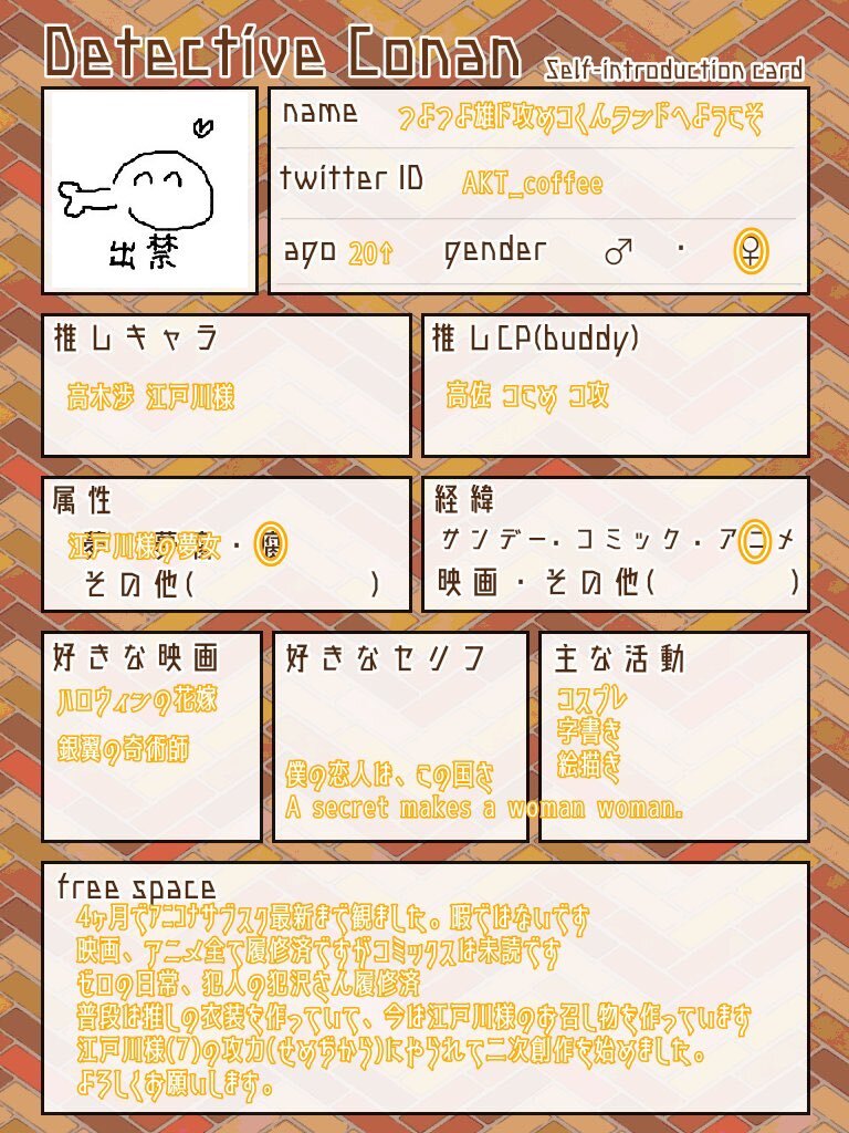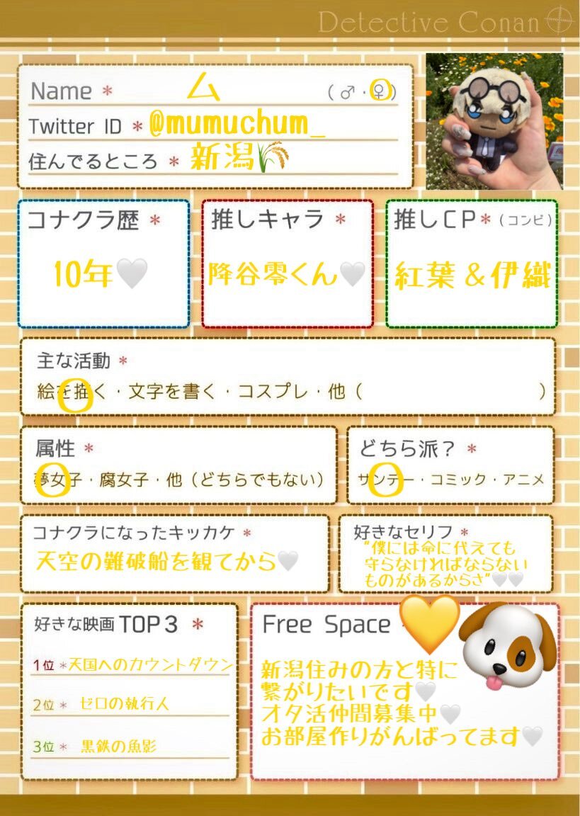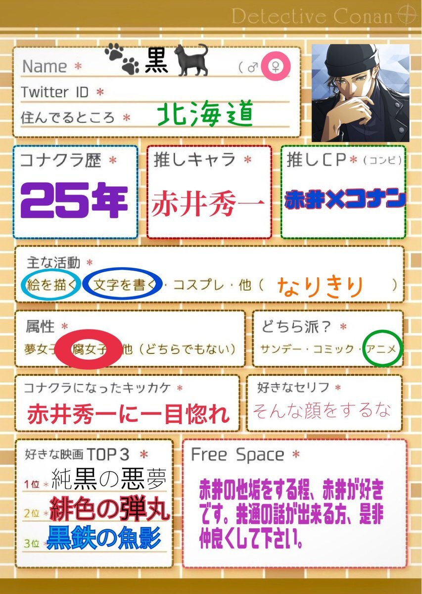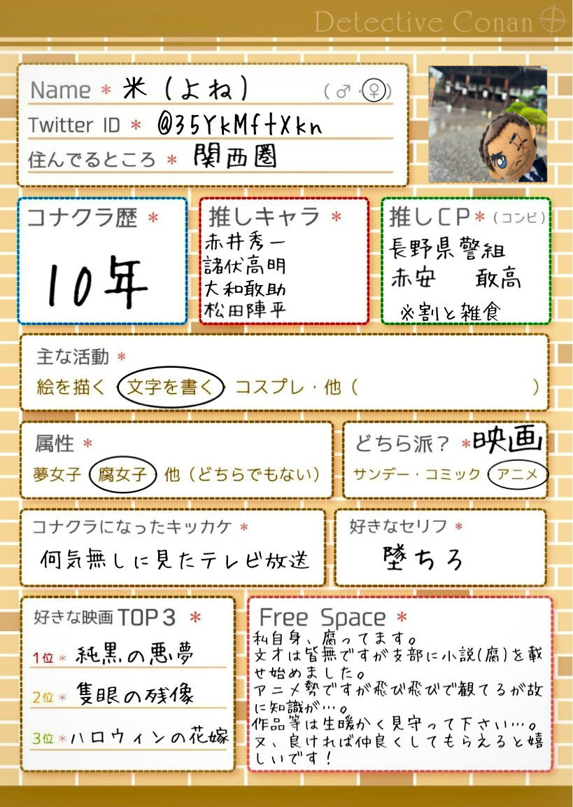 ⚠️不具合の為、作り直しました🙇‍♂️ マイペースに推し活中。 文字書き(支部に載せてます)メイン。 聖地巡礼も行きます✨ 楽しくお話して下さるお友達を探してます!☺ ♻️or🫶で気になる方をお迎えに参ります😌 #コナクラ自己紹介カード #コナクラさんと繋がりたい #名探偵コナン好きさんと繋がりたい pic.x.com/SJIJ2ZiXIO