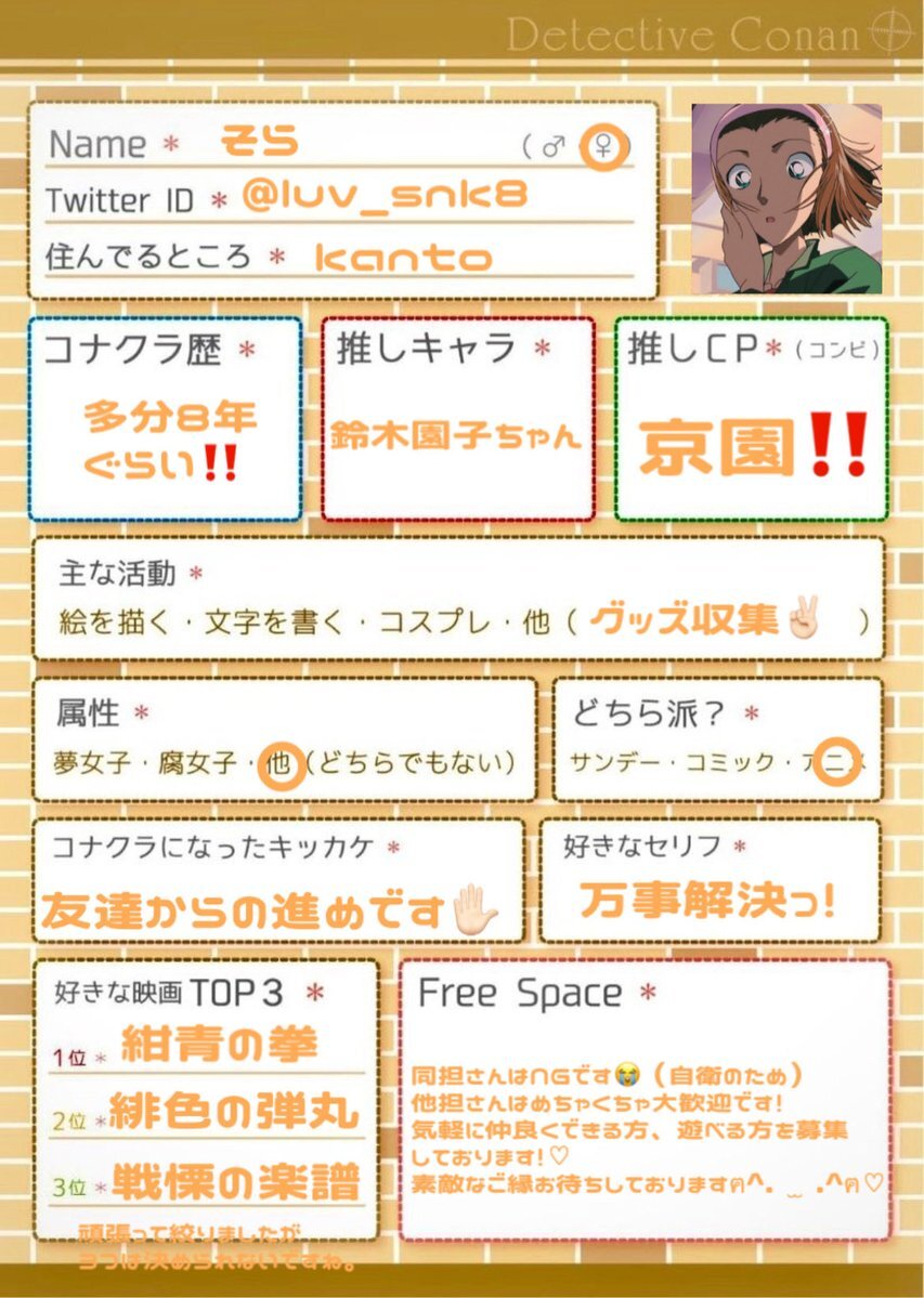 名探偵コナンプロフお借りしました 名探偵コナン好きさんと話したい! #名探偵コナン好きさんと繋がりたい #京園好きさんと繋がりたい #名探偵コナンプロフ RT&いいねの方フォローさせて下さい! 何か不快になるアカウントは基本的 ブロックしてしまうのでごめんなさい🙇🙇 pic.x.com/ZOKR4yFRqh