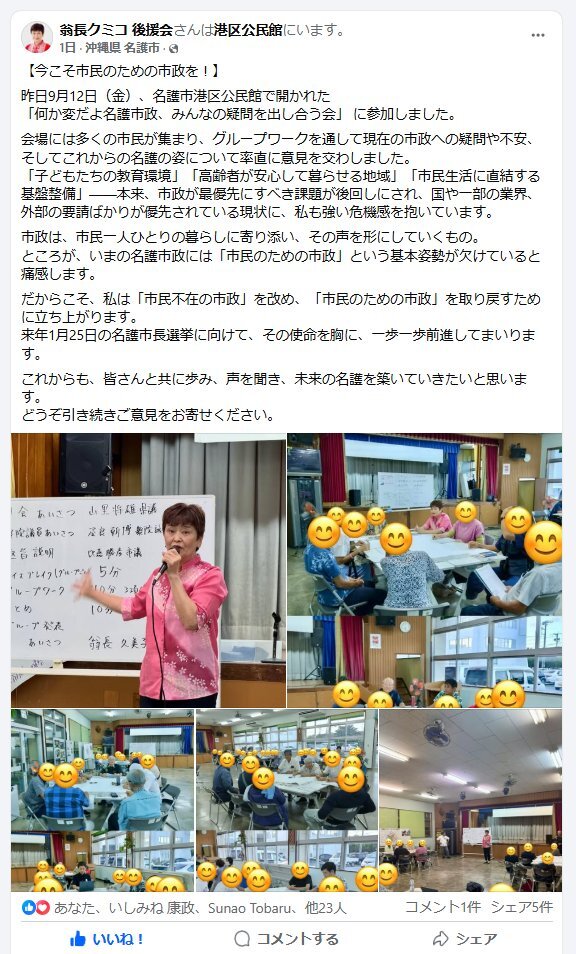 #名護市議会議員 #翁長クミコ 後援会Fbを転写 facebook.com/kumikoo0405/po…#今こそ市民のための市政を!】 昨日9月12日(金)、名護市港区公民館で開かれた 「何か変だよ名護市政、みんなの疑問を出し合う会」 に参加しました… #1月25日 #名護市長選2026 #名護市長選予定候補 #女性目線 #市民目線 pic.x.com/Wb759AlTYn