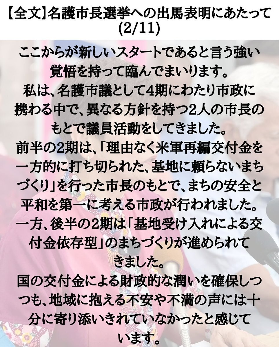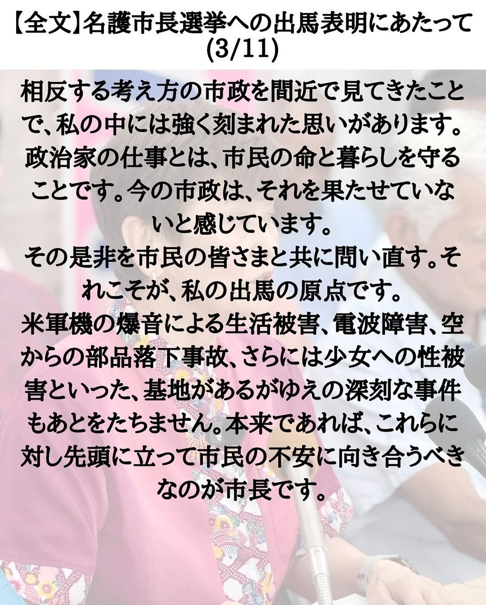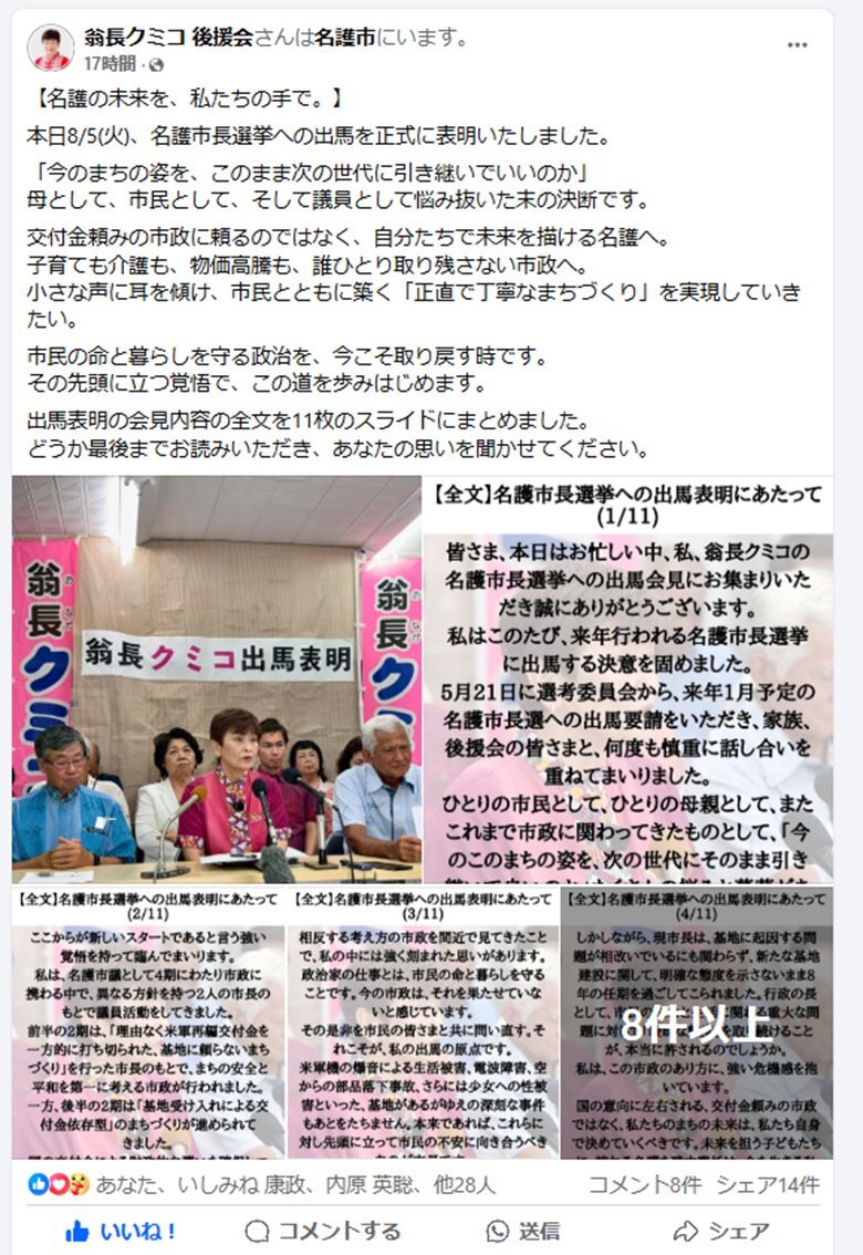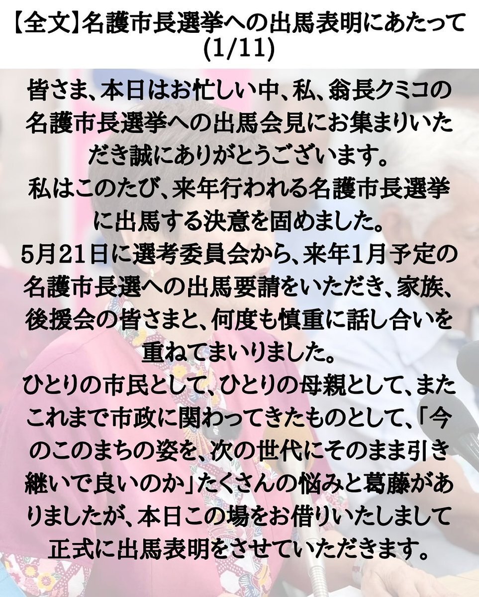 🌺#名護市長選予定候補 #翁長クミコ 後援会Fb転写 facebook.com/kumikoo0405 【名護の未来を、私たちの手で】 本日8/5(火)、名護市長選挙への出馬を正式に表明いたしました。 「今のまちの姿を、このまま次の世代に引き継いでいいのか」 母として、市民として、そして議員として悩み抜いた末の決断… pic.x.com/oJG5rC9myb