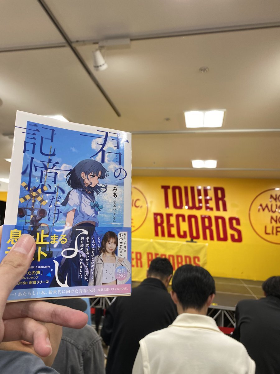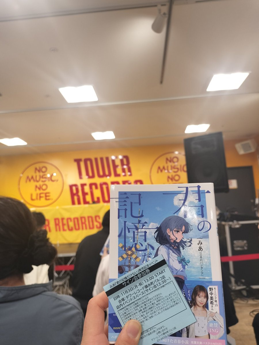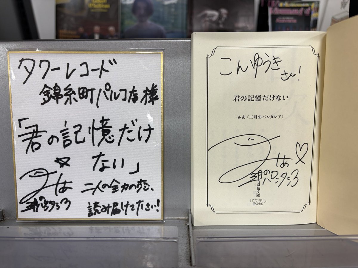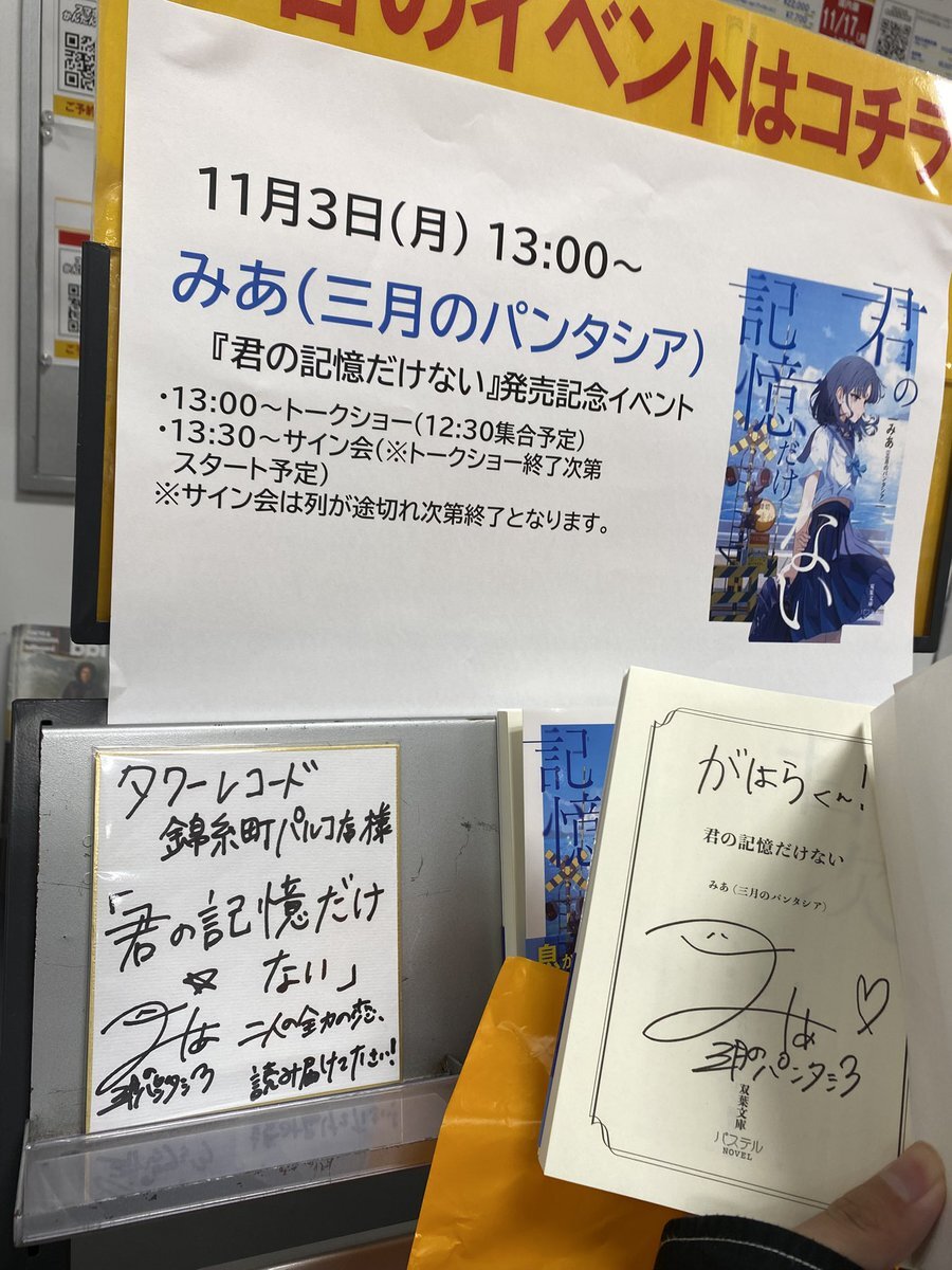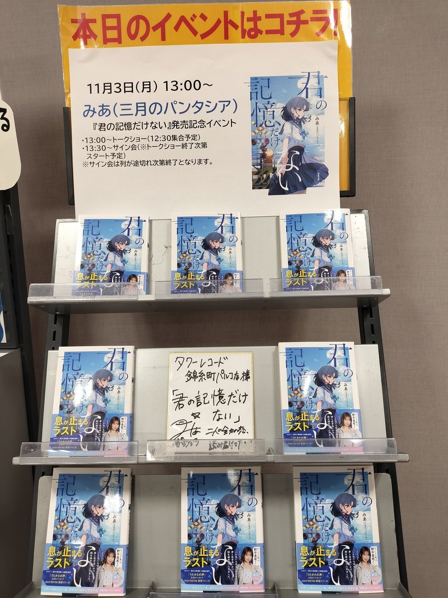 本日はタワーレコード錦糸町パルコ店にて 三パシみあさんによる 小説「#君の記憶だけない」 発売記念トークショー&サイン会です⤴️ トークショー(質問)とビンゴ大会終わりました。 残念ながらビンゴなりませんでしたが、色んな話しや、小説家みあ部長のお姿が見れて楽しかったです👏🏻 #三月のパンタシア pic.x.com/MNQ3Jpan5y
