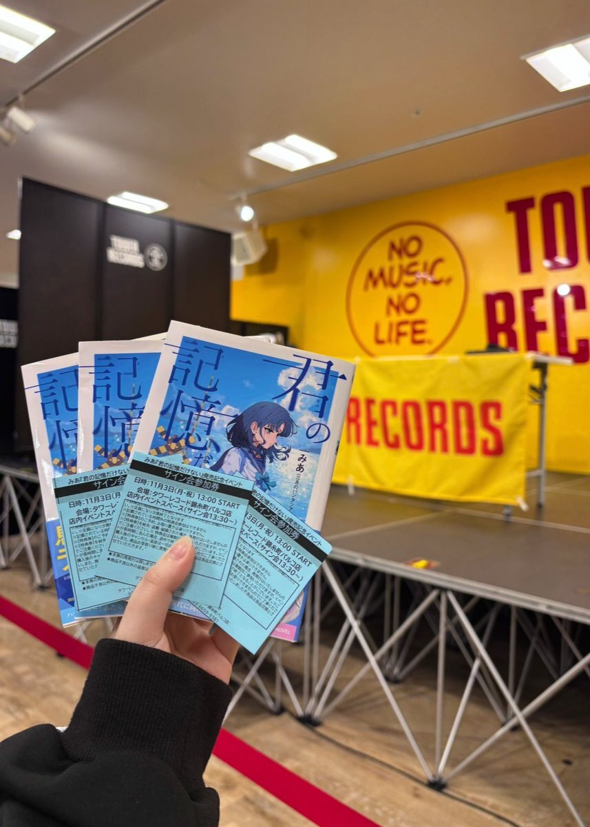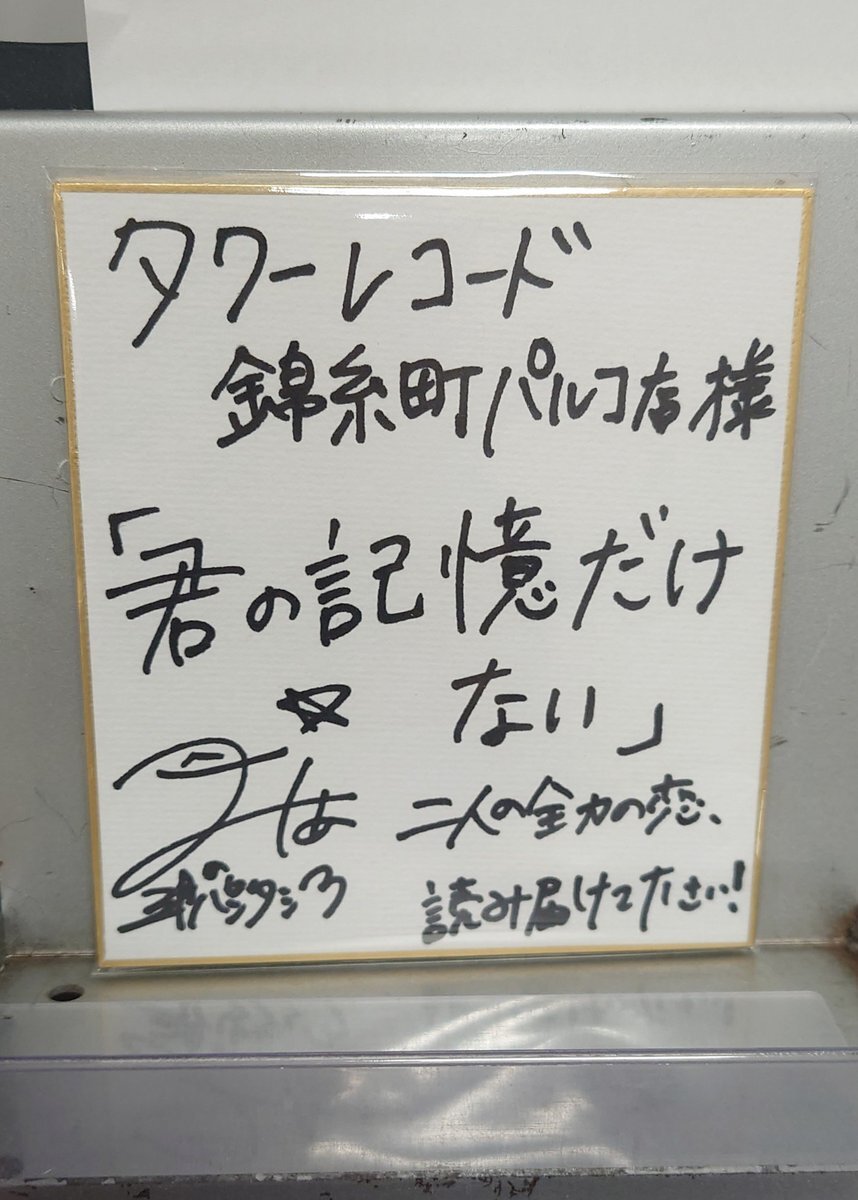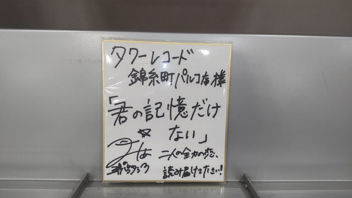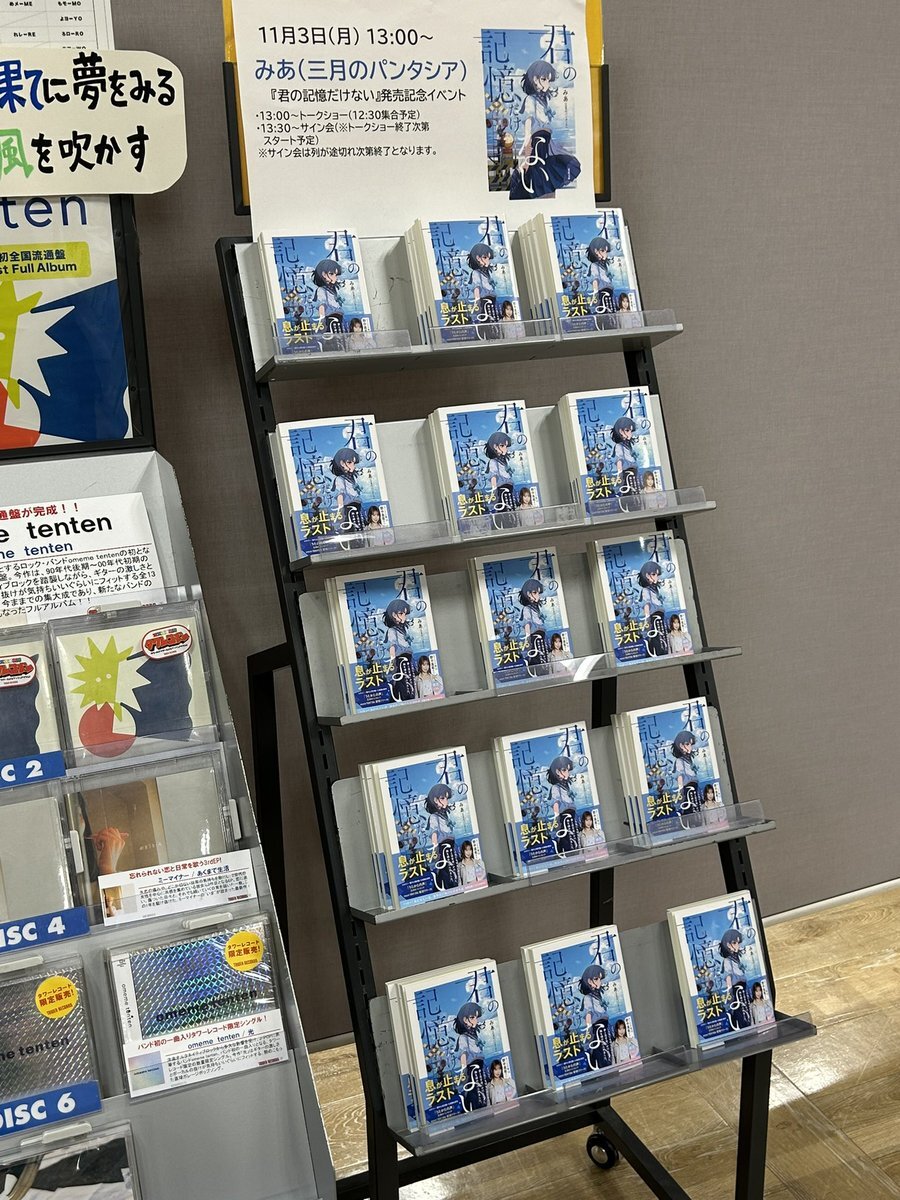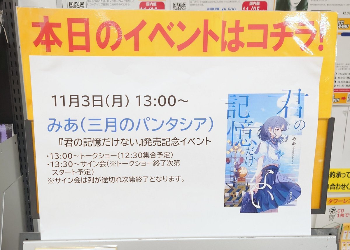 本日はタワーレコード錦糸町パルコ店にて 三パシみあさんによる 小説「#君の記憶だけない」 発売記念トークショー&サイン会です⤴️ トークショー(質問)とビンゴ大会終わりました。 残念ながらビンゴなりませんでしたが、色んな話しや、小説家みあ部長のお姿が見れて楽しかったです👏🏻 #三月のパンタシア pic.x.com/MNQ3Jpan5y