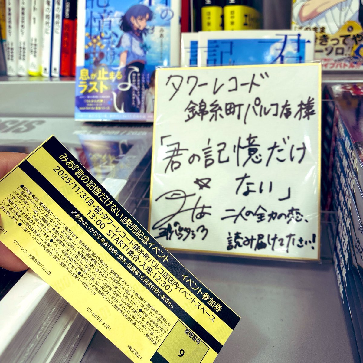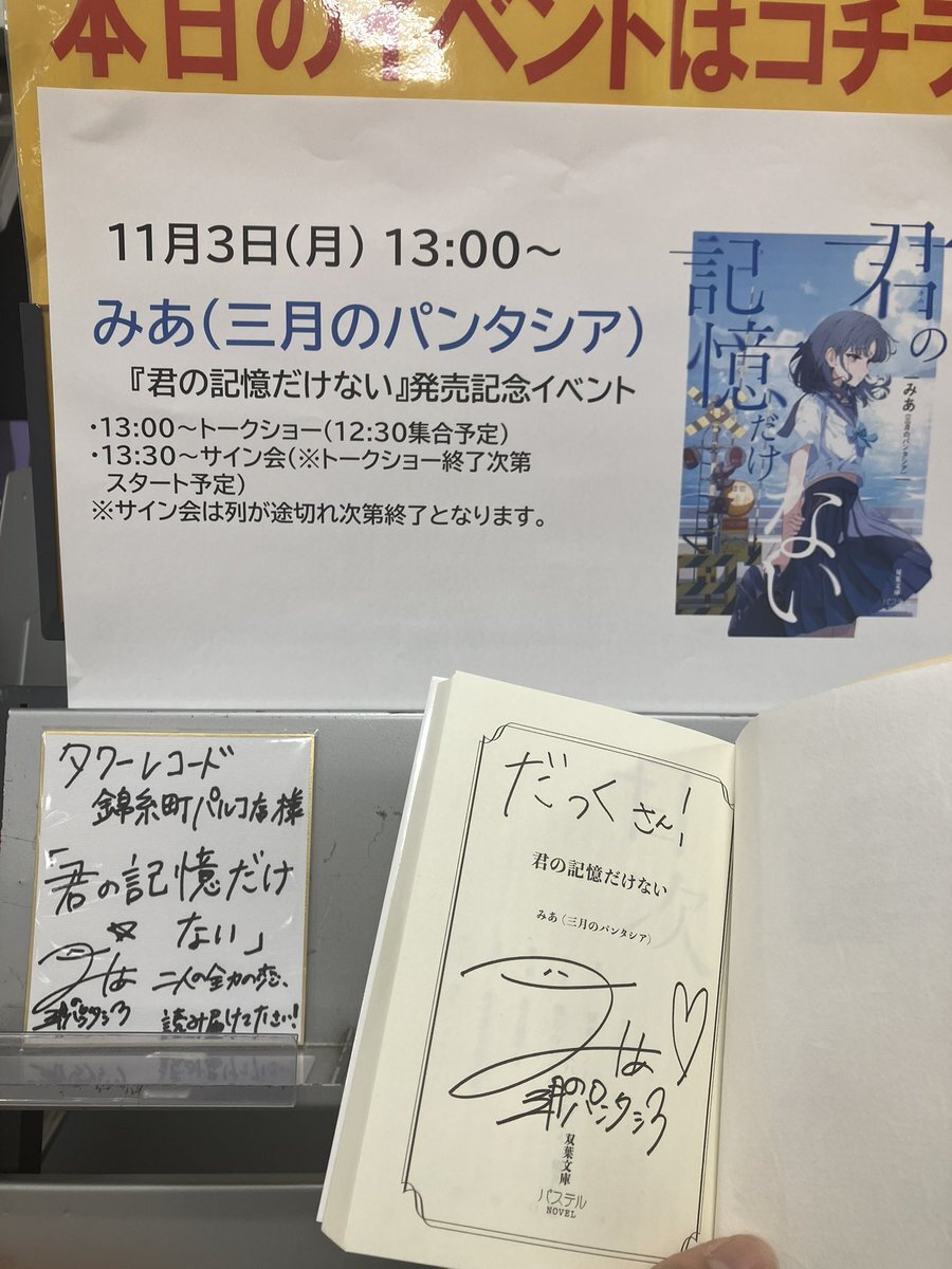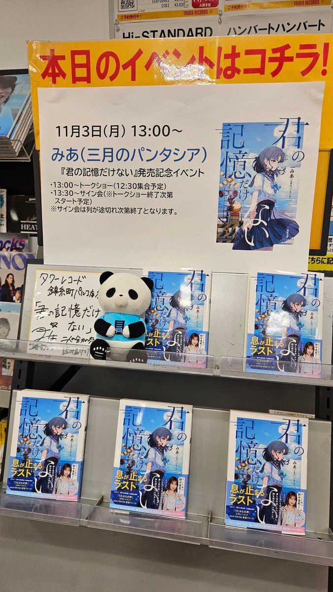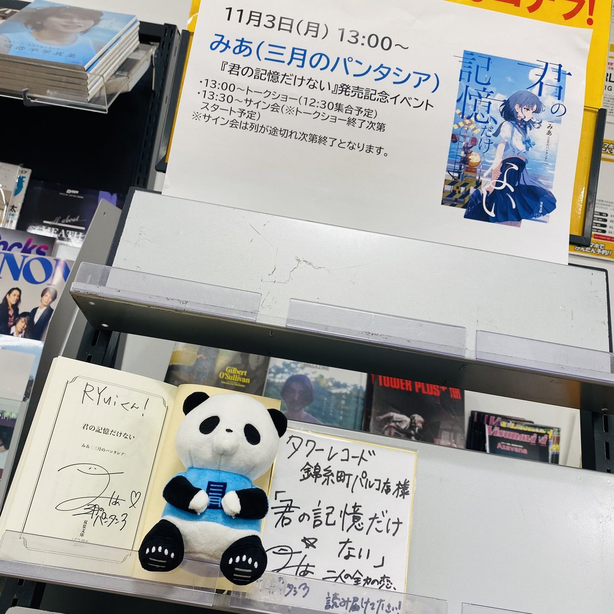 【📢イベント情報】 みあ待望の2作目となる長編小説『 #君の記憶だけない 』発売記念したトーク&サイン会の開催が決定しております🐼📚´- 皆様ぜひ遊びに来てください✨ 日時:11月3日(月祝) 13:00 場所:タワーレコード錦糸町パルコ店 5F ▽詳細はこちら tower.jp/store/event/20…