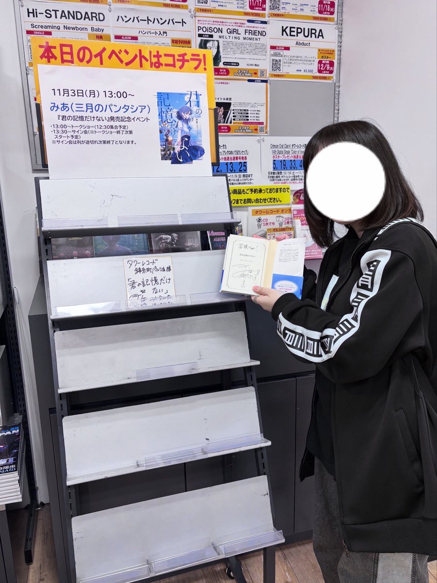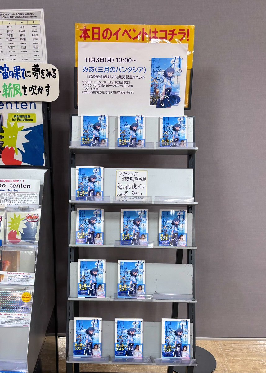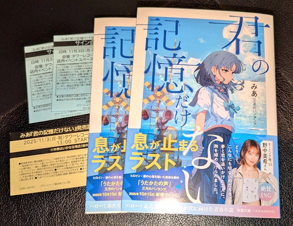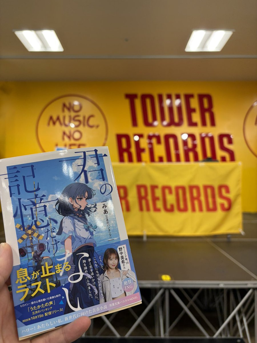 【📢イベント情報】 みあ待望の2作目となる長編小説『 #君の記憶だけない 』発売記念したトーク&サイン会の開催が決定しております🐼📚´- 皆様ぜひ遊びに来てください✨ 日時:11月3日(月祝) 13:00 場所:タワーレコード錦糸町パルコ店 5F ▽詳細はこちら tower.jp/store/event/20…