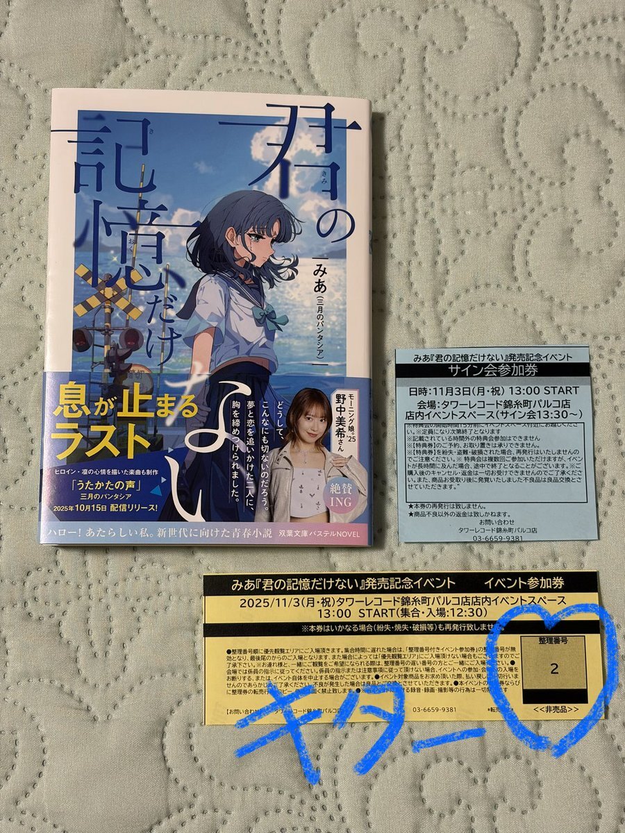 【📢イベント情報】 みあ待望の2作目となる長編小説『 #君の記憶だけない 』発売記念したトーク&サイン会の開催が決定しております🐼📚´- 皆様ぜひ遊びに来てください✨ 日時:11月3日(月祝) 13:00 場所:タワーレコード錦糸町パルコ店 5F ▽詳細はこちら tower.jp/store/event/20… pic.x.com/FESz6SbKzz