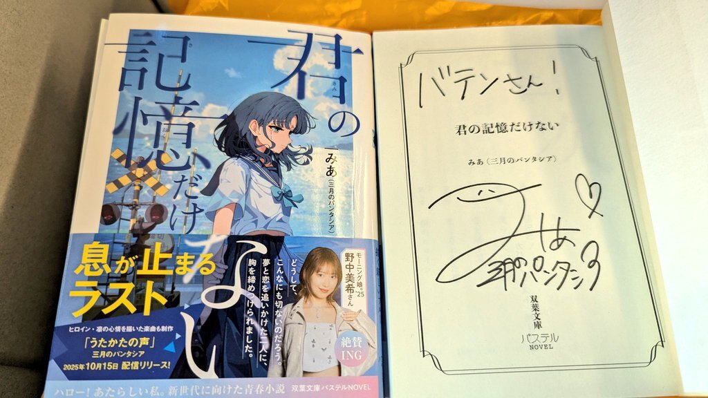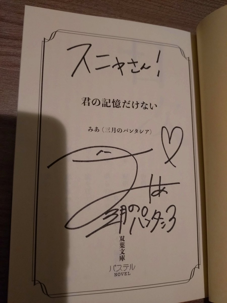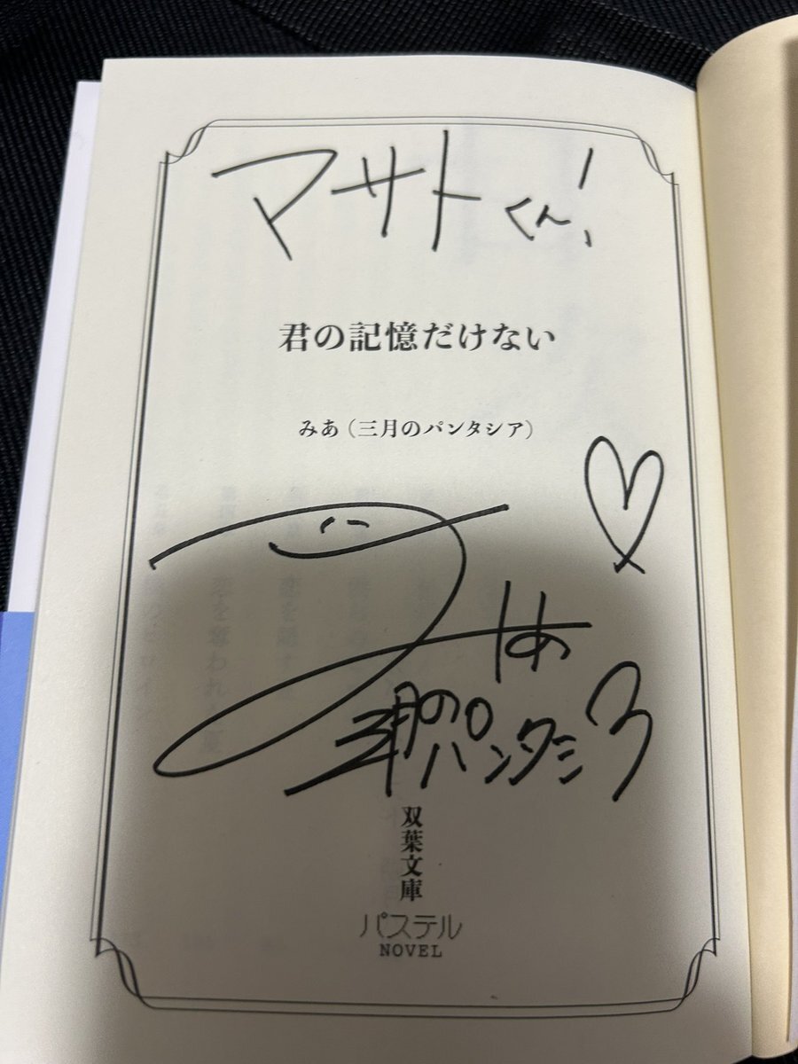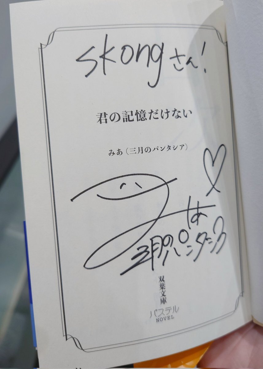 みあさんの言葉は繊細で愛おしい心の機微を丁寧に紡いでいて、いつも心に寄り添ってくれるんです📘 今回トップバッターでサインをいただきましたがかなり長い時間お話しできて、小説の感想や近況などをお伝えできました🍀 邂逅ありがとうございました! #君の記憶だけない pic.x.com/d9MeOwiTqd