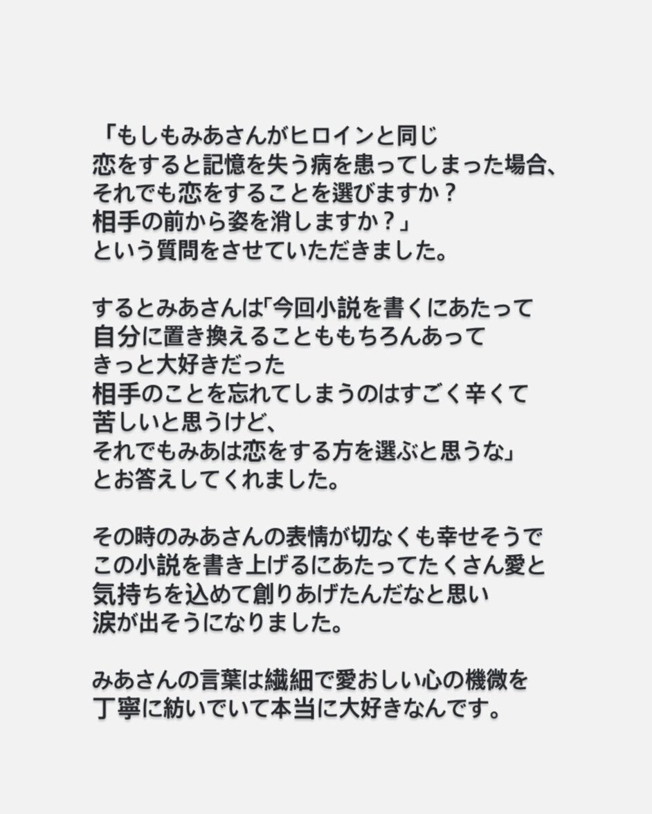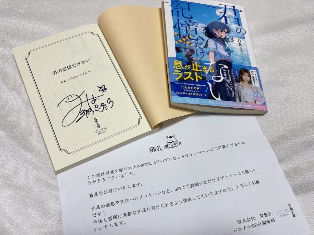 / 本日発売📕✨ 小説『君の記憶だけない』 \ みあ待望の2作目となる長編小説『 #君の記憶だけない 』が本日発売となりました! ぜひお手に取ってチェックしてください🤲🏻 さらにみあ本人による抜粋版の朗読配信もaudibleにてスタート🗣︎💬 抜粋版のaudible配信はこちら audible.co.jp/pd/B0FRS9ZS5H?… pic.x.com/q188dvn0A1