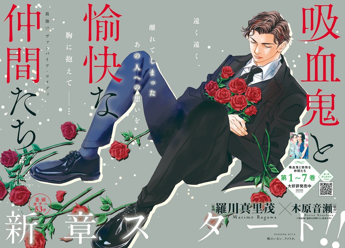 【#メロディ12月号大好評発売中🦇】#漫画/羅川真里茂 原作/木原音瀬 「#吸血鬼と愉快な仲間たち」SEASON4 ACT.1掲載! 巻頭カラーにて、堂々新章スタート! 暁にアメリカに置いていかれ、酷く傷心のアル…。彼のもとに、キエフが現れて…!? pic.x.com/eNKOflayYQ
