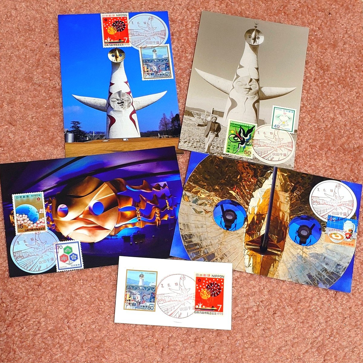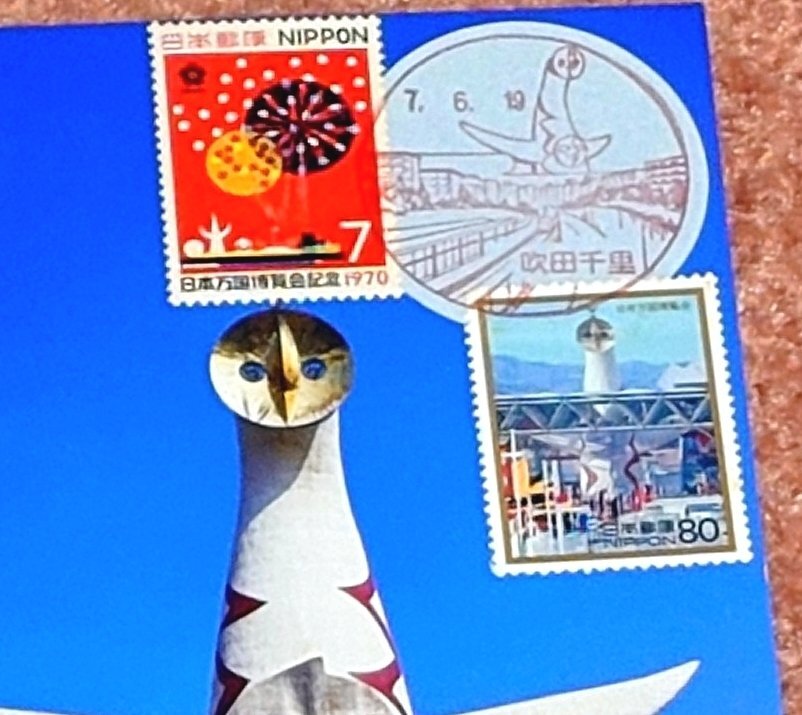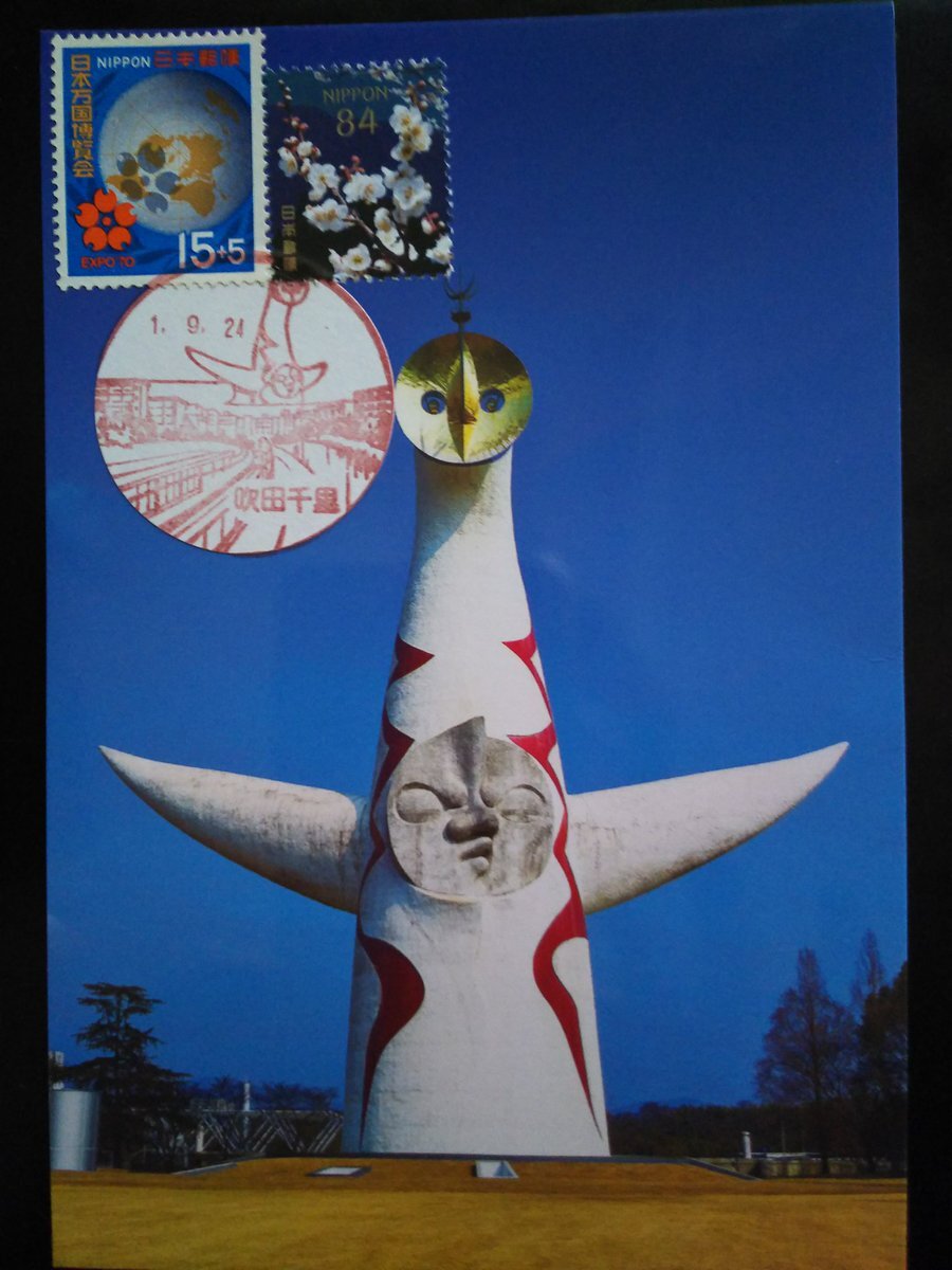 先日太陽の塔の見学に行った際絵葉書を買ってきたので、#吹田千里郵便局 に郵頼。切手は日本万国博覧会切手とシンボルマークの桜をあらわしました。ちなみにこのマークは大高猛氏によるもので、周囲が五大陸、真ん中が日の丸だそう。あのカップヌードルの容器をデザインした方でもあります! #風景印 pic.x.com/pUEn5wn5jD