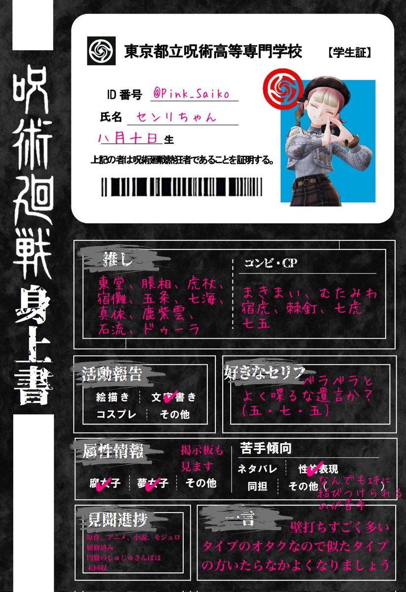 #呪術廻戦自己紹介カード #呪術廻戦好きさんと繋がりたい #呪術廻戦好きな人と繋がりたい タグとテンプレお借りしました❣️モジュロも読んでる本誌派なので同じ人いたら仲良くしてほしいです!! いいねで趣味合いそうな方お迎えに行きます♡ pic.x.com/LCdrLasz3C