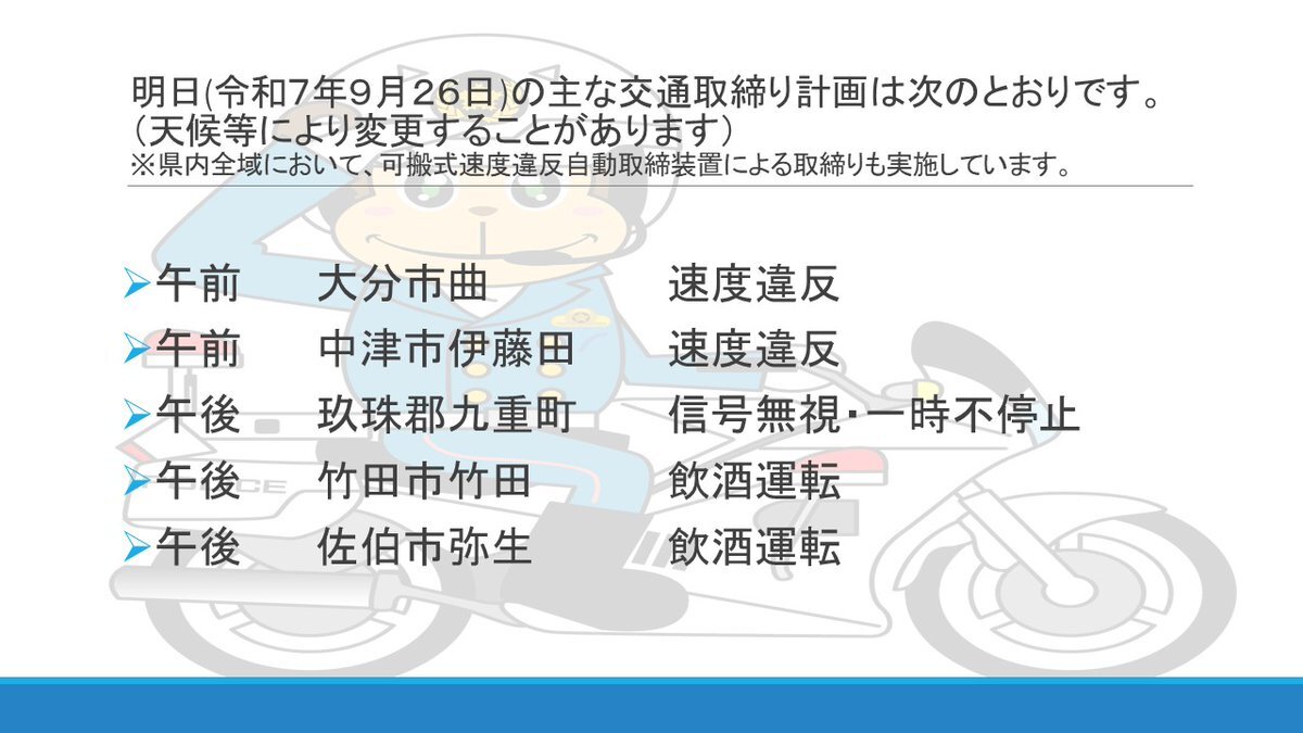 【交通取締り情報】 明日の取締り予定です。 飲酒運転は犯罪です。 飲酒運転は絶対に「しない・させない・許さない!」 「飲んだらのれん」を合言葉に、一滴でもお酒を飲んだら絶対に運転しないでください。 #大分県警察 #飲酒運転