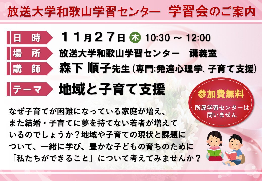 #放送大学 #和歌山学習センター #学習会 のご案内です。 11月27日(木)10:30~12:00 #森下順子 先生 『地域と子育て支援』 参加費無料、所属学習センターは問いません。 ぜひご参加ください! sc.ouj.ac.jp/center/wakayam… pic.x.com/wM2dF4eaKD