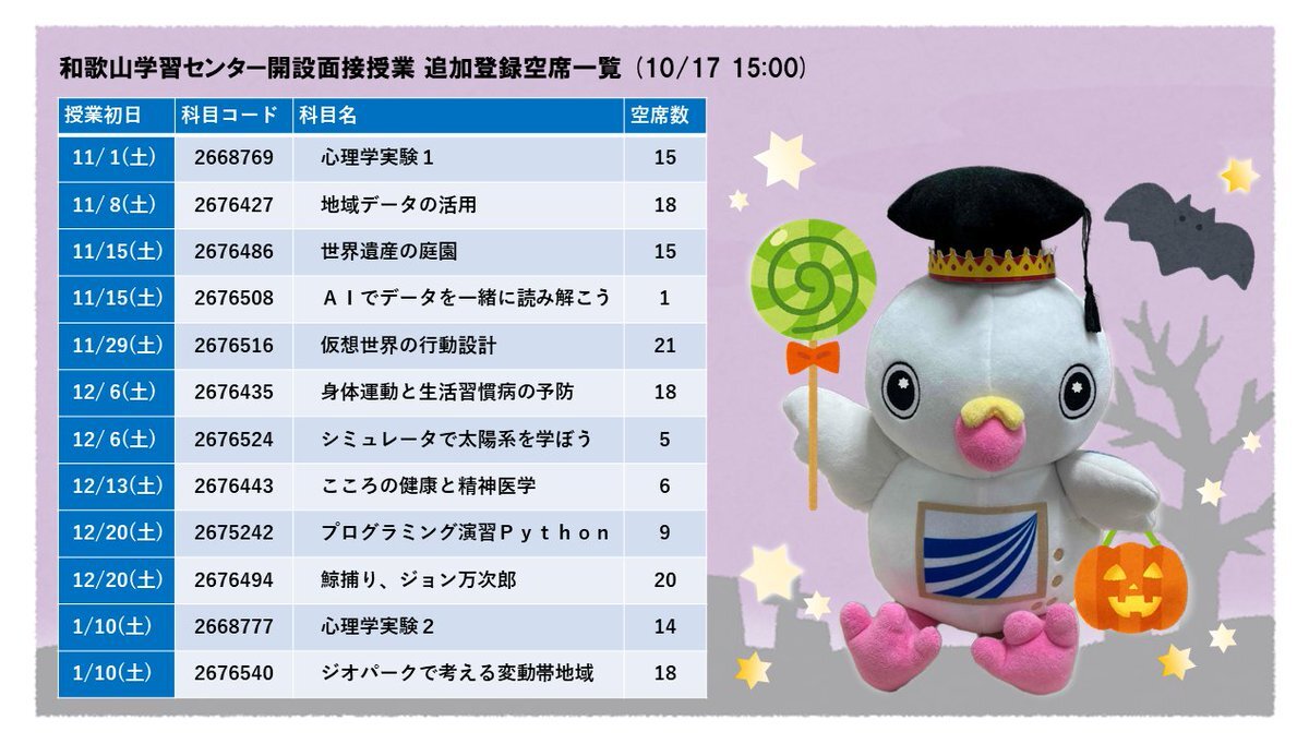#放送大学 #面接授業 の追加登録事前申請受付は「10月22日(水)13時10分まで」です。 #和歌山学習センター の空席一覧はご覧の通りです。 以下のページからも確認していただけますので、よろしくお願いいたします。 sc.ouj.ac.jp/center/wakayam… pic.x.com/SdjBpyWHQJ