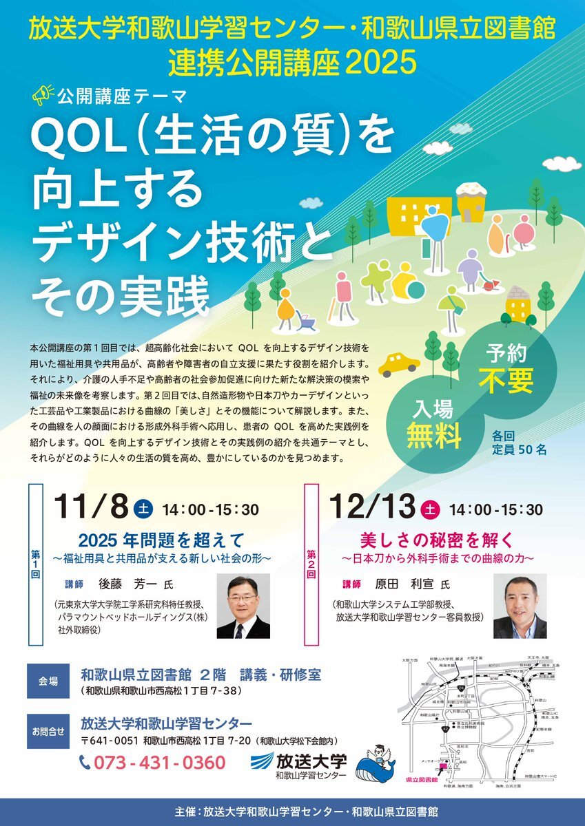 #放送大学 #和歌山学習センター と #和歌山県立図書館 では、「QOL(生活の質)を向上するデザイン技術とその実践」をテーマに公開講座を実施します。 入場無料&申し込み不要ですので、ぜひご参加ください! #QOL #福祉用具 #共用品 #日本刀 #外科手術 #曲線 sc.ouj.ac.jp/center/wakayam…