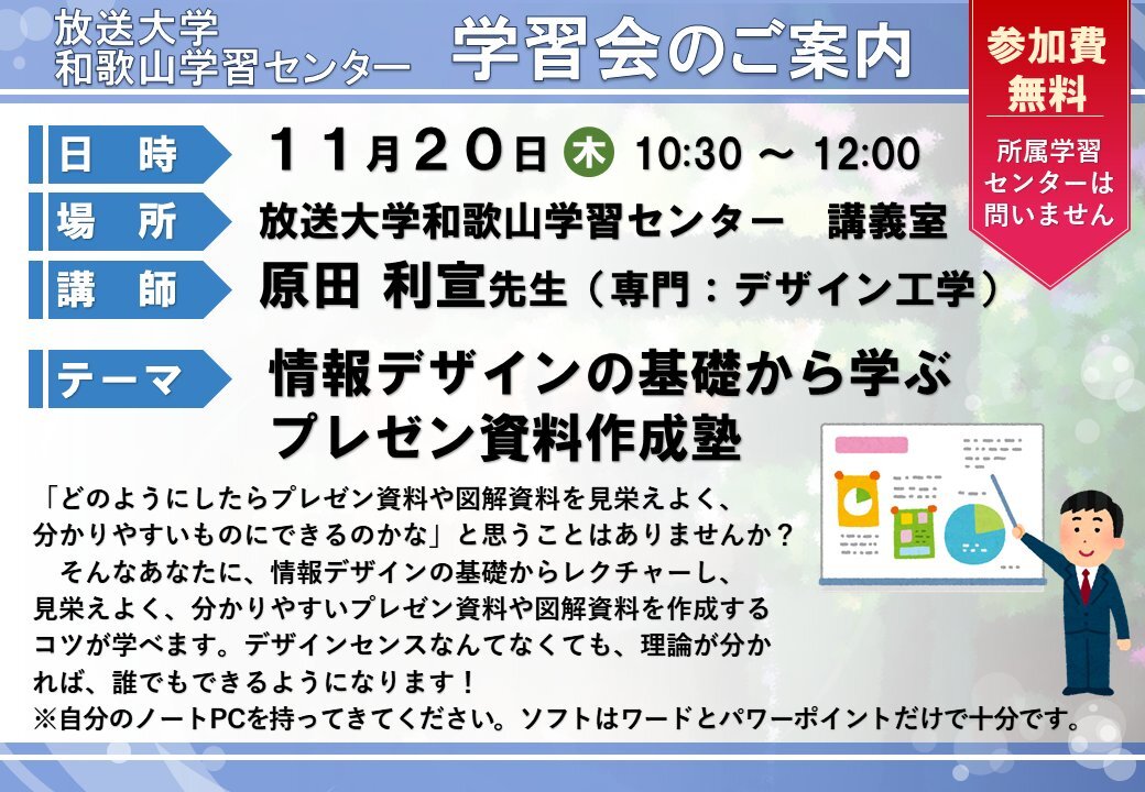 #放送大学 #和歌山学習センター #学習会 のご案内です。 11月20日(木)10:30~12:00 #原田利宣 先生 『情報デザインの基礎から学ぶプレゼン資料作成塾』 参加費無料、所属学習センターは問いません。 ぜひご参加ください! sc.ouj.ac.jp/center/wakayam… pic.x.com/WCkU8BXL1w