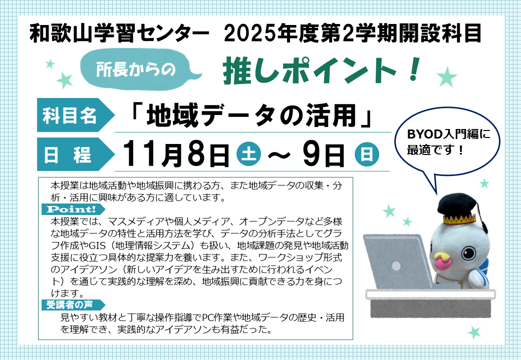 #放送大学 #和歌山学習センター の2025年度第2学期 #面接授業 「地域データの活用/ #満田成紀 先生」11/8(土)・9(日) 追加登録受付中です。ぜひ紹介動画をご覧ください。登録をお待ちしております! youtube.com/watch?v=rWMelU…