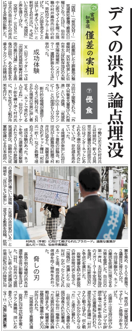 宮城県の河北新報の偏向報道がひどい。 権力におもねる新聞。情けない。 投票日前日には、村井知事がSNSで一方的に誹謗中傷を受けているとの記事。 私もSNSで誹謗中傷を受けており、村井知事から直接の誹謗中傷を受けたが、河北は全く取り上げず。 共同通信は、私も村井知事も同様に取り上げた。