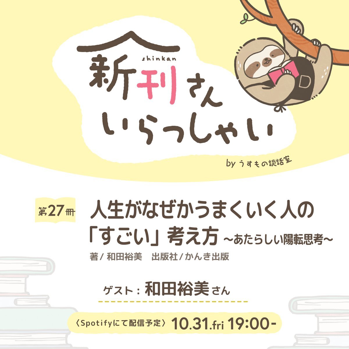 10/31(金)19:00-の #新刊さんいらっしゃい は #かんき出版『#人生がなぜかうまくいく人の「すごい考え方」』ゲストは #和田裕美 さん! 陽転思考を身につければ物事の見え方が変わりました…! 実践編についてもうかがいました。こちらはSpotifyで配信です♪ #うすもの談話室 x.gd/jVYhe pic.x.com/zVfUqDxr7z