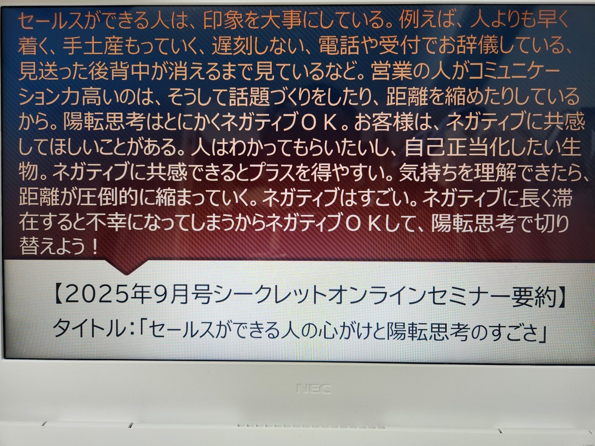 【2025年9月号シークレットオンラインセミナー要約】 タイトル:「セールスができる人の心がけと陽転思考のすごさ」#和田裕美 #陽転思考 #パワースクール #新刊 #人生がなぜかうまくいく人のすごい考え方〜あたらしい陽転思考〜 #シークレットオンラインセミナー pic.x.com/RkDaNbNY9w