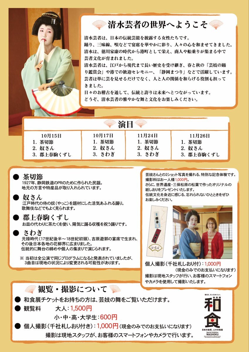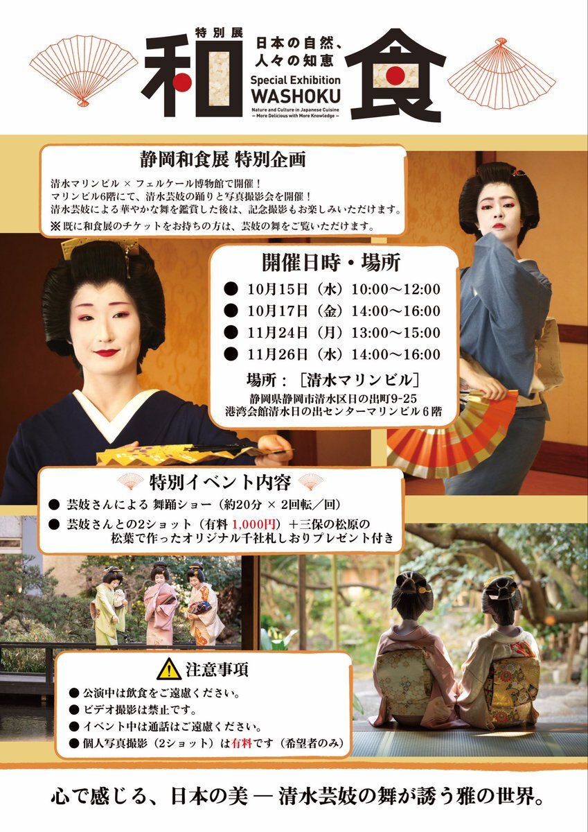 和食展にて「清水芸妓さんの舞」が鑑賞できます。 清水マリンビルでお待ちしております🚢 #和食展 #清水芸妓 #和食展 pic.x.com/Dkr2bCd2Lt
