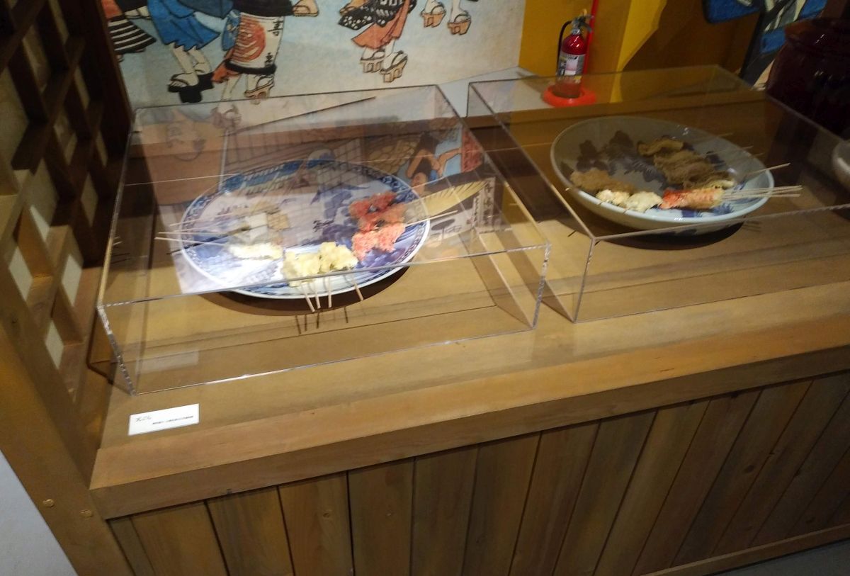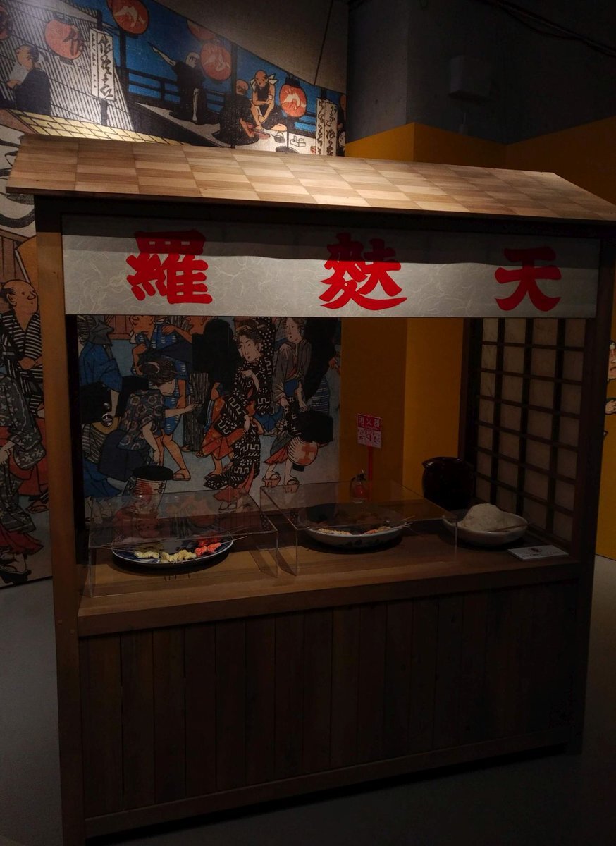 #国立科学博物館 #和食展 江戸時代の天ぷら屋台。 今見るようなの以外にも、から揚げや串揚げ、すり身みたいなのも天ぷら扱いだったらしい。 で、一串4文。 1両4千文として……40円~100円くらい? 当時でも安価なファーストフードだったそうで。 pic.x.com/ft9XZWdoI2