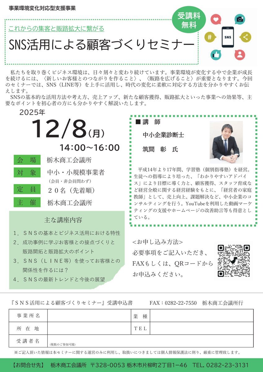 【SNS活用による顧客づくりセミナー】開催のお知らせ 今回のセミナーでは、SNS(LINEアカウント等)をわかりやすく解説いたします。 日時:12月8日(月)14:00~16:00 会場:栃木商工会議所 お申込みは forms.gle/tW1vMz55LsHoeA… #栃木市 #商工会議所 #SNS #LINE pic.x.com/LQPZCGcS1V