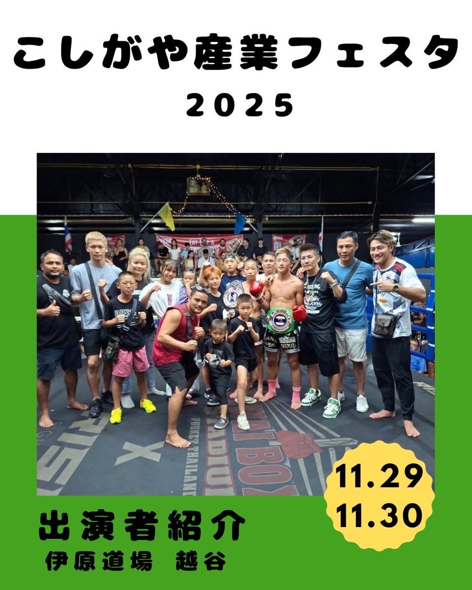 子どもから大人まで幅広い世代に格闘技を通じた学びと成長の場を提供していらっしゃるそうです!伊原道場越谷は 11/29(土)11:55ごろより第一体育室 館内ステージにて!#越谷市 #商工会議所 #青年部 #個人事業主 #起業支援 #産業フェスタ #越谷産業フェスタ2025 pic.x.com/qqVyJ3sPz6